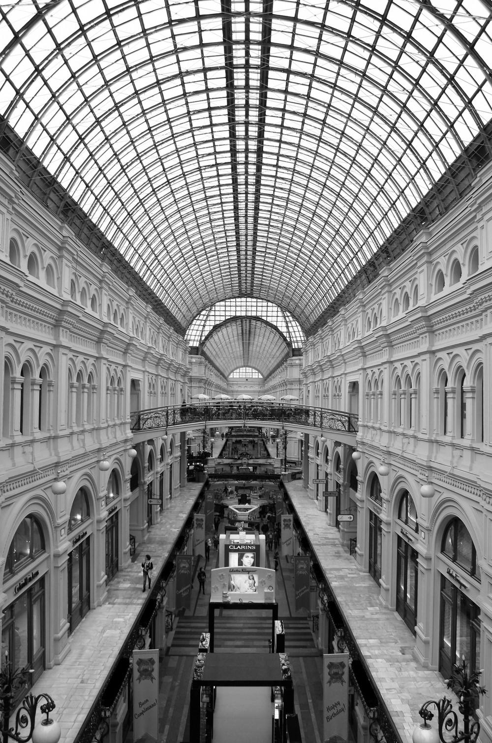 Уникальный архитектурный орнамент интерьерам ГУМа придает полукруглый ажурный стеклянный свод в сочетании с частым ритмом небольших окон в фигурных обрамлениях XVII века.