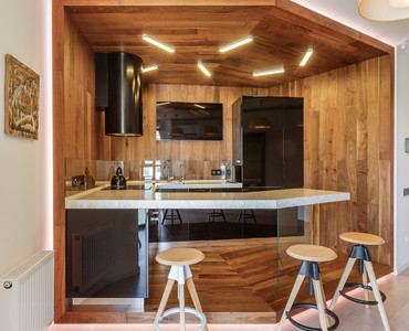 Неправильная планировка квартиры поспособствовала оригинальному решению исполнения кухни. Зону выделили кубом, выполненным из американского ореха и вписали в него мебель. Особенность кухни в ее "вылетающей" столешнице, парящей в воздухе.