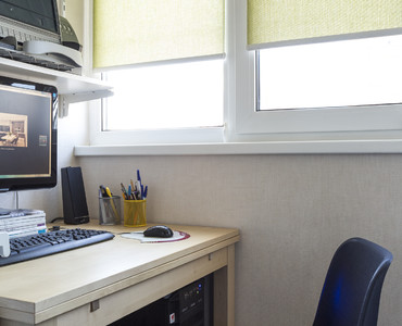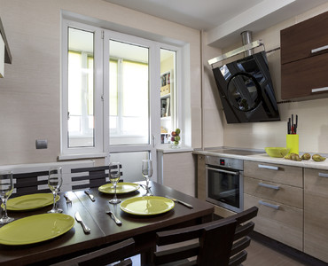 Кухня в современном, функциональном стиле. Цветовое и текстурное решение контрастное - венге и оттенки бежевого, матовые и глянцевые поверхности. Свежий зеленый вносит активный акцент в сдержанную цветовую гамму помещения. Цветовое и стилистическое решение переходит и на утепленную лоджию, где разместился небольшой кабинет. Небольшая по площади кухня объединяет в себе две зоны- собственно кухню и столовую зону. Кухонный гарнитур оснащен всей необходимой техникой. В столовой зоне прекрасно вписалась полка для бокалов и утвари, которая закреплена с помощью скрытых держателей.
