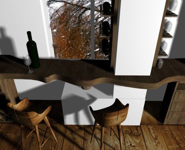 Эскизный проект реальной мансарды для клиентки, которая планирует использовать мансарду в основном зимой для отдыха с друзьями и для своего хобби - изготовления небольших предметов декора. Для работы был предложен стол из цельного слэба дерева и металлической трубы квадратного сечения. Для отдыха - барная стойка (монтируется к сушествующей каминной трубе)и диваны. Интерьер решен почти монохромно - белые стены и дерево. Проект находится в процессе реализации.