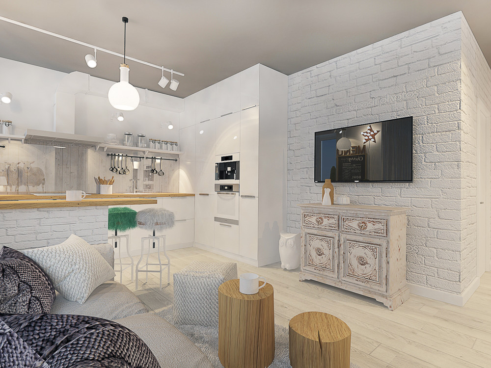 Интересный и эклектичный интерьер двухкомнатной квартиры, в основе которого лежит сочетание контрастных и не сочетаемых, на первый взгляд, материалов. Стены почти по всей квартире белые с разным декором. Часть мебели белая глянцевая, например, кухня, а часть на контрасте - состаренная со множеством деталей и деревянных элементов. Например, пни, декор на светильниках, вагонка на фартуке кухни. Дерево является неотъемлемой частью этого проекта, оно делает его интересным, живым, законченным. А сочетание дерева и мягкого текстиля (шкур, меховых и вязаных подушек) делают интерьер домашним и уютным.