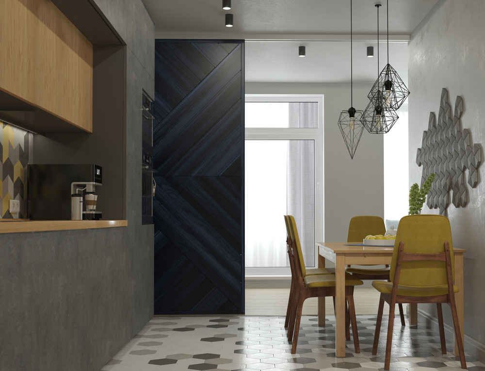 Деревянные откатные перегородки, как способ зонирования кухни и гостинной, еще интересная деталь интерьера. Глубокий синий цвет, геометричный рисунок и деревянное полотно приобретает свой "изюм", как и все пространство.