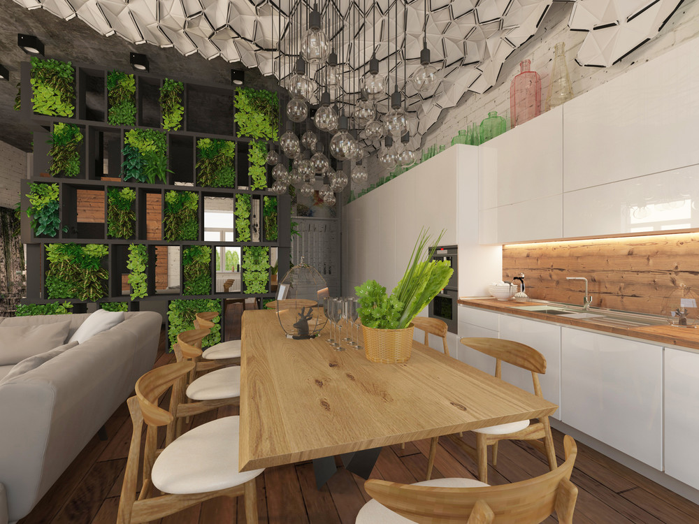 Остальное пространство гостиной и столовой решено очень просто и минималистично. Мы решили частично оставить кирпичную кладку и покрасили прямо по бетону потолок. Украшением потолка стала специальная сборная конструкция, придуманная бельгийскими дизайнерами и завоевавшая множество наград за оригинальный дизайн. Она очень красиво поддерживает природную тему нашего эко-лофта и завершает дизайн.