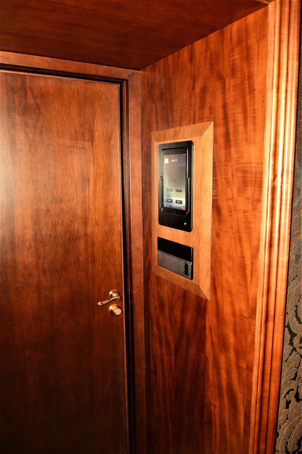 Основной интерфейс системы управления реализован на iPad. Планшет установлен в настенную моторизованную док-станцию iRoom. Здесь же установлен контроллер управления освещением Lutron GRAFIK Eye QS.