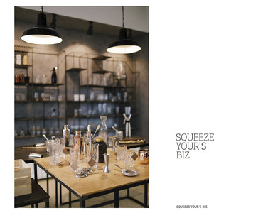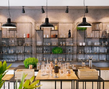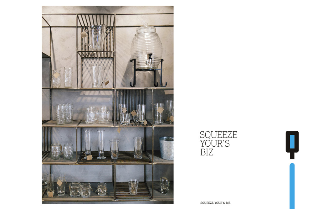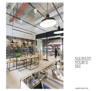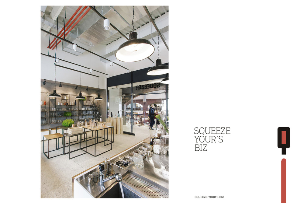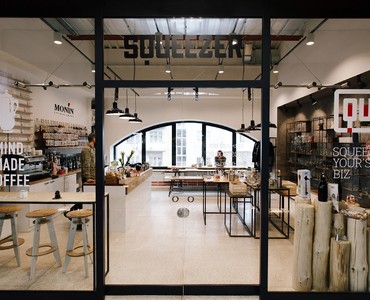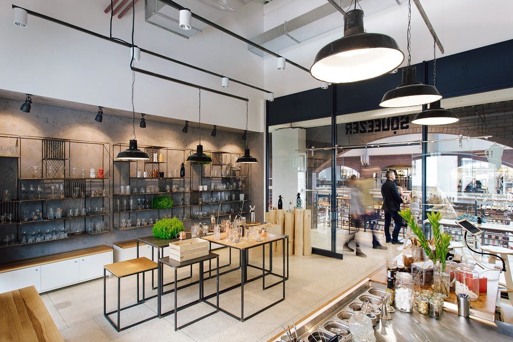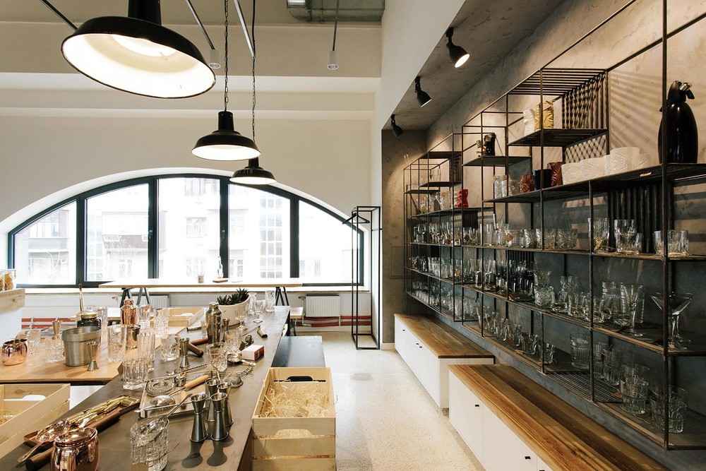На одной из старейших торговых площадок Харькова, Сумском рынке, среди прилавков со всевозможными продуктами и товарами разместилась уютная кофейня, совмещенная с шоурумом, имя которой Squeezer. Так что помимо кофе гости заведения могут полюбоваться набором барной посуды, представленным в шоу-руме. Весь ассортимент расположен на подсвечиваемых деревянных полках с металлическим каркасом, которые выглядят одновременно брутально и утонченно на фоне грубой бетонной стены. Дизайнеры использовали светлые оттенки и «голые» поверхности не случайно: товары и предметы декора таким образом выгодно выделяются на их фоне и задают настроение залу.
