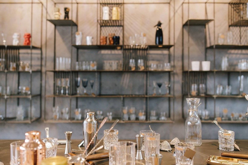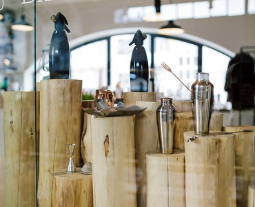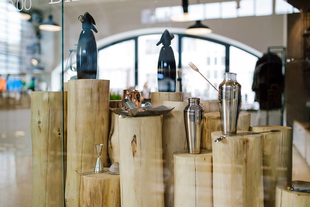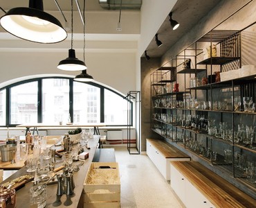 Так что помимо кофе гости заведения могут полюбоваться набором барной посуды, представленным в шоу-руме. Весь ассортимент расположен на подсвечиваемых деревянных полках с металлическим каркасом, которые выглядят одновременно брутально и утонченно на фоне грубой бетонной стены.