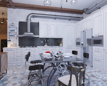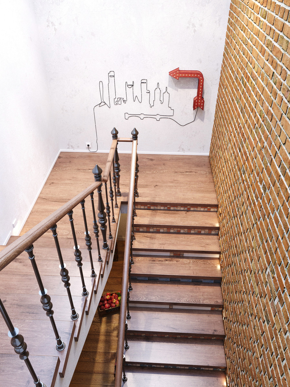 Дизайн-интерьера дома выполнен для людей, увлекающихся музыкой и ценящих семейных традиции. Стилистика лофта, выбранная хозяевами, в большей или меньшей степени выдержана во всех помещениях дома. Наиболее ярко стиль прослеживается в гостиной-кухне-столовой: красный кирпич и штукатурка на стенах, пол из массива доски, темные потолочные балки и «заводские» трубы. Мягкая зона с телевизором решена в более ярких цветах, с пестрыми орнаментами обивки кресел и диванных подушек, а также разнообразием теплых оттенков дерева, придающих этой части помещения особый уют. Вместе с тем насыщенное цветовое решение гостиной уравновешивается спокойной гаммой кухни-столовой, выполненной в белых, серых и голубых тонах. Конечно, в этот фон отлично вписалась графичная и брутальная металлическая мебель и светильники. В спальнях мы, напротив, постарались создать более мягкий вариант лофта. Полы здесь отделаны художественным паркетом, который контрастирует с простотой отделочных материалов стен, а потолочные карнизы и лепнина на потолке делают интерьер комнат более изысканным.