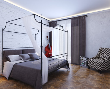 В спальнях мы, напротив, постарались создать более мягкий вариант лофта. Полы здесь отделаны художественным паркетом, который контрастирует с простотой отделочных материалов стен, а потолочные карнизы и лепнина на потолке делают интерьер комнат более изысканным.