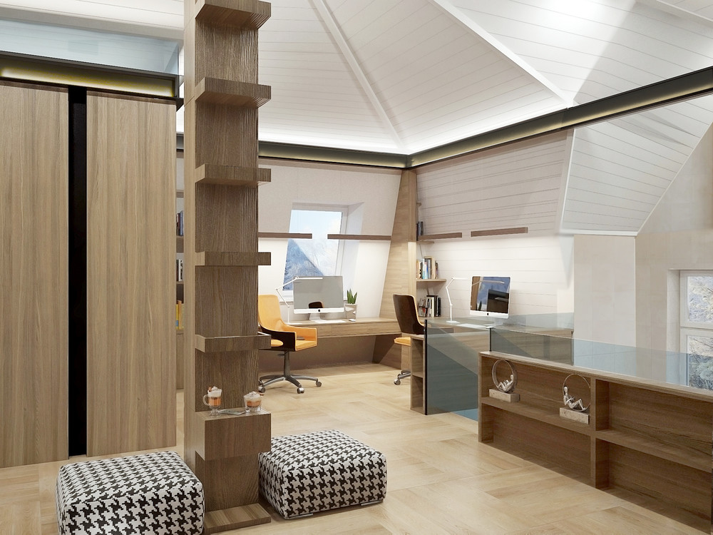 При обсуждении будущего интерьера для девочек подростков, заказчиком была поставлена задача оформить мансарду в стиле лофт, но не использовать при этом кирпич, лишь дерево, стекло и металл, что усложняло задачу. В данном интерьере был сделан акцент на оформление деревянных балок металлическим швеллером, который служил для подсветки, вертикали и горизонтали из него придавали геометрию. Перегородки со стеклом помогли зонировать помещения, но избежать дробности, сохранив визуально единый потолок.