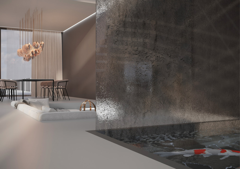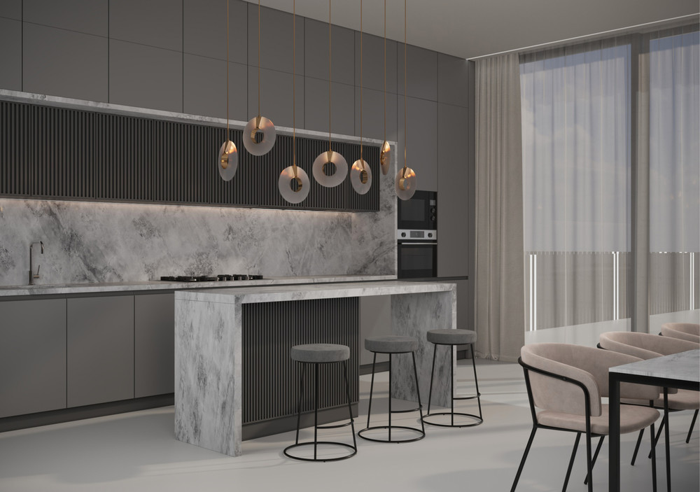 Дизайн-проект разработан для семейной пары с дочкой, подростком. Муж и жена – этнологи, которые раньше много путешествовали. Их любимая страна – Япония. Поэтому дизайн таунхауса выполнен в стиле минимализм с элементами японского стиля. Материал камня был использован в нескольких помещениях таунхауса. Например, в мастер-санузле родителей мы видим мраморную раковину. В мастер-спальне же камень используется в качестве объемной стеновой панели. Ступени сделаны из белого кориана. В гостиной мы также можем увидеть каменную объемную стеновую панель. А на кухне и в столовой использован серый мрамор.