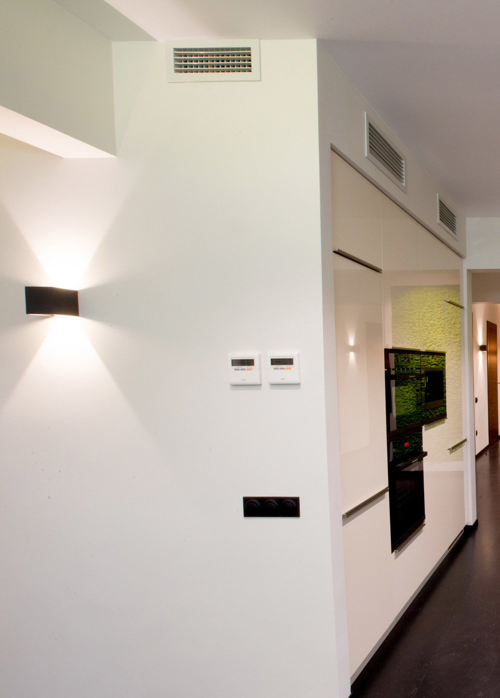 Светлые и уютные апартаменты в центре Санкт-Петербурга. В данном проекте было решено уйти от повсеместного решения – подбирать электроустановочные изделия под цвет стен. Мы заложили ЭУИ фирмы “ABB”, модель “Impuls” черного цвета. В результате выключатели и розетки стали своеобразным дизайн-акцентом, поддерживая связь с черным полом и черными настенными и потолочными светильниками. Год реализации проекта 2016