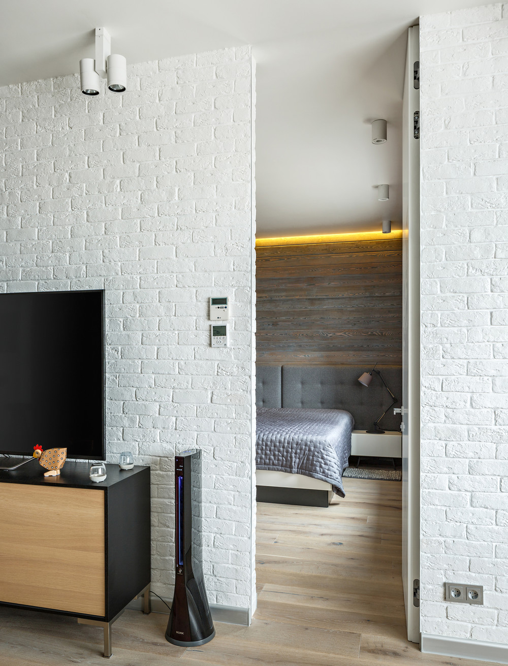 Кухню разместили на территории прихожей , сан узлы оставили там где они есть получилось открытое пространство кухни и гостиной с столовой группой у окна и для перекусов у кухонного острова . Центр квартиры это гостиная с кухней , и из этого пространства мы попадаем и в спальную с одной стороны и в детскую с другой стороны т.е гостиная является проходной . Заказчики молодая пара , активные , по стилю предпочли лофт но не жёсткий а мягкий и уютный . Год реализации 2016