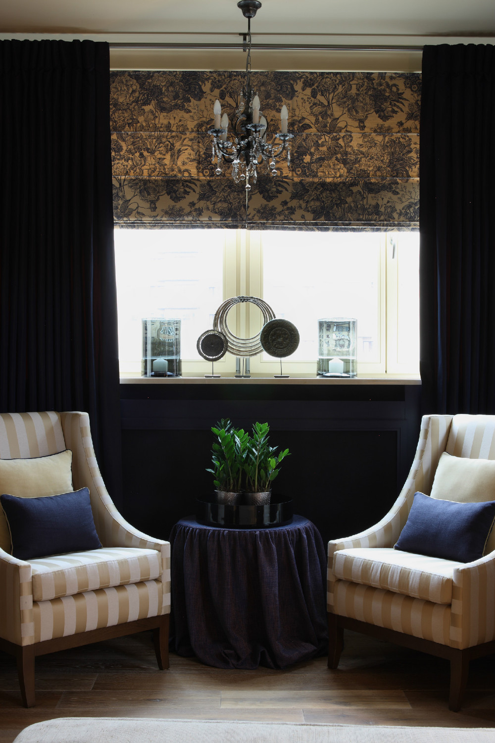 Интерьер этой квартиры отличается наличием очень активных цветов, делающих пространство энергичным и плотным. Коньяк, пьемонтский баклажан, горький шоколад, насыщенный золотой, глубокий синий - вот палитра сложных, вибрирующих и благородных оттенков. Фактуры и материалы были использаваны с целью поддержки этой густой и терпкой цветовой гаммы. Чтобы она смотрелась ярко и отчетливо применено много отражающих поверхностей - большое зеркало, глянцевые фасады комодов и кухни, витражное остекление дверей, лаковые консоли... Образ получился яркий, целостный, драматичный и очень эмоциональный.