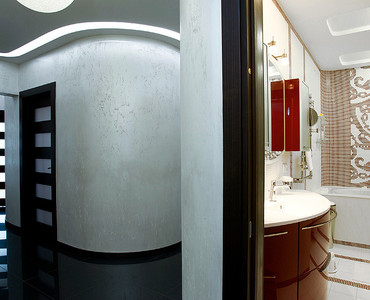 5 м2. Фотограф Максименко И. Изначально предопределили выбор трех красочных доминант: белого, красного, черного. Эффектность и выразительность этой палитры хорошо известна, однако гармоничной она становится лишь тогда, когда тональность и интенсивность цветов, соразмерность их цветовых масс точно выверены и уравновешивают друг друга. Попробуйте мысленно смешивать три исходных краски, и Вы получите все оттенки красного, серого и розового, которые встречаются в дизайне этих интерьеров.