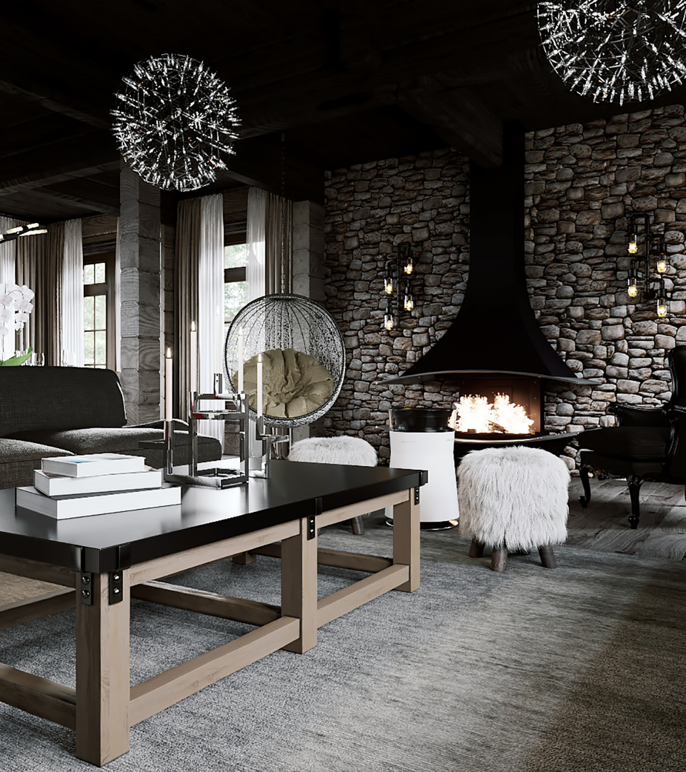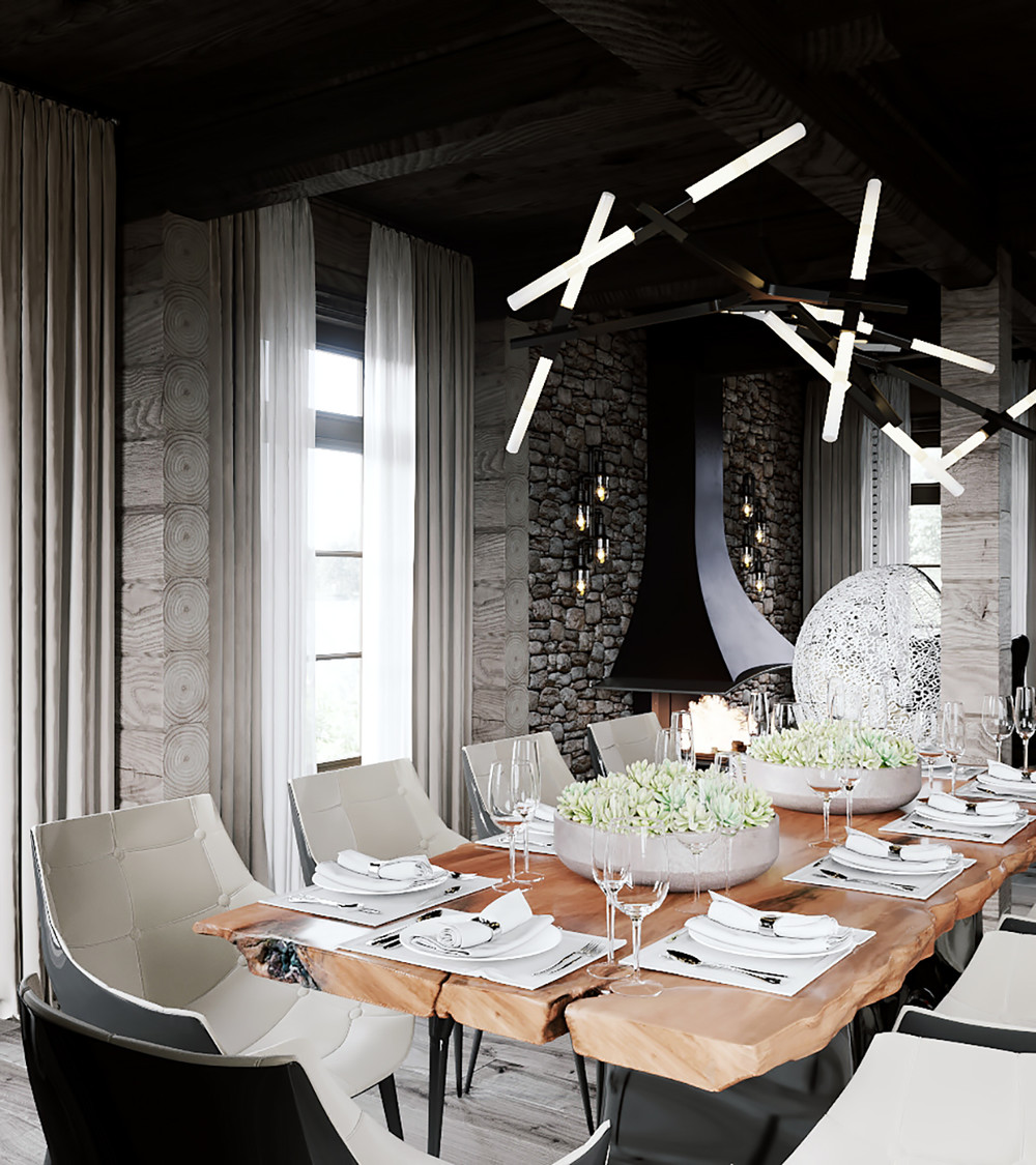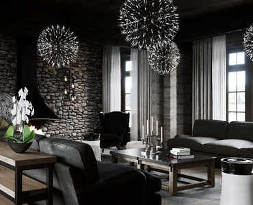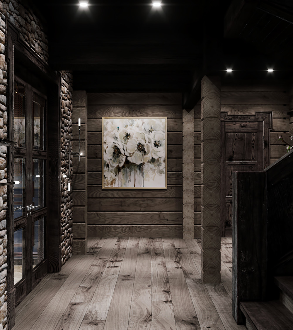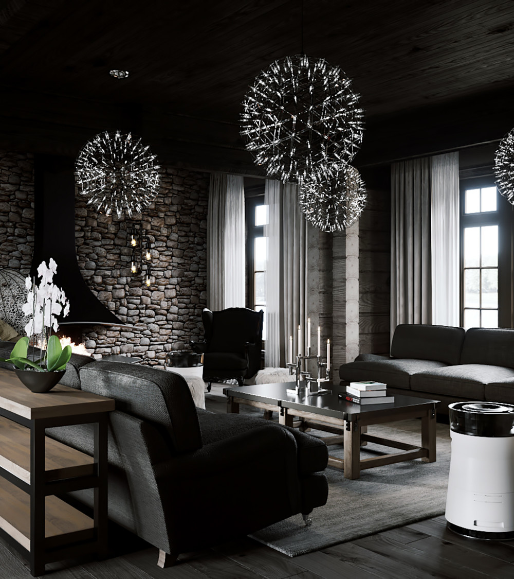 Этот интерьер – крепость, островок стабильности и тепла. Независимо от погоды за окном здесь царит покой и размеренность. Созданию уютной обстановки способствует и природная цветовая палитра и натуральные материалы и, конечно, камин. Нарочито приближенные друг к другу тона привлекают больше внимания к фактурному разнообразию. Дерево с подчеркнутой естественной красотой, четкие линии металла, брутальный камень, несут чистую энергетику. А максимально открытая планировка, способствуя большей диалогичности между материалами, дает много пространства для движения этой энергии. Красиво стареющие отделочные материалы, специально состаренные поверхности, современные детали и передовые технологии – телевизор, холодильник, климатический комплекс от LG SIGNATURE – создают комфортный, функциональный и вместе с тем живой интерьер.