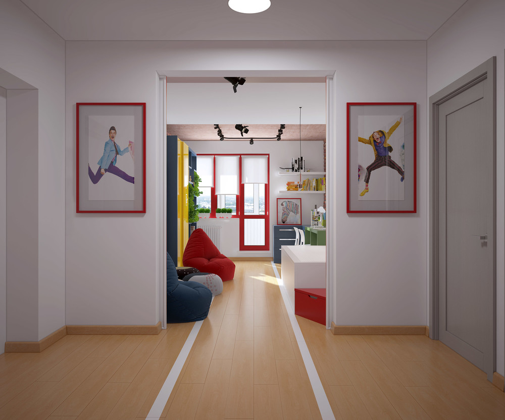 Для расширения игрового и развивающего функционала детской предусмотрена возможность выхода за ее пределы, с использованием части коридора и лоджии, без их присоединения. Белые полосы на полу детской, продолжающиеся в коридор, обозначают дорожку для боулинга. Над детским боулингом расположен дартс. Поперек лоджии справа расположился шкаф для инструмента. Слева сконструирован небольшой верстак. Если ребята захотят что-то смастерить из дерева, у них есть все для этого и детская при этом не пострадает.