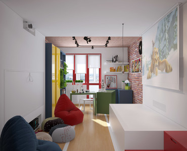 Концепция проекта – «ЭКСПЕРИМЕНТАНИУМ», пространство для игр, исследований, развития и расширения кругозора. Ничего привычного и наскучившего и максимум трансформации и механизмов - того, что так любят все дети. Пространство детской разделено на 4 зоны: зона сцены и сцена и зрительный зал экспериментальный уголок и вертикальный огород зона учебы и хранения вещей зона игр Сцена и зрительный зал представляют собой сочетание стационарной мебельной конструкции, конструкции из гипсокартона на стенах и потолке и набора пуфов. Днем возле правой стены - сцена. Возле левой стены располагается зрительный зал – набор пуфов для ребят. Ночью нажатием кнопки дети превращают сцену в кровать для одного ребенка. Лямка на левой стене позволяет откинуть кровать для второго. Она устроена по принципу верхних полок железнодорожных поездов. В углу комнаты расположен экспериментальный уголок. Стол со столешницей из устойчивого к воздействию химреагентов, температуры и ударам слоистого пластика с полностью выдвижными ящиками, механизм которых позаимствован у «волшебного уголка» для кухни, заполнен вещами для экспериментов по химии, физике и прочих хобби. Дети смогут проявить себя в качестве настоящих маленьких ученых, выжигать по дереву, паять микросхемы, вырезать из пенопласта и так далее. У стены напротив расположен вертикальный огород, здесь дети могут выращивать то, что им нравится: лук, бамбук, все что угодно. Рабочие столы на колесах обеспечивают каждому из братьев личное пространство при учебе. Зона хранения вещей - обычный шкаф-купе. Зона для игр располагается между шкафами и зоной учебы и может быть увеличена за счет зрительного зала, пуфы которого можно убрать в коридор. Для расширения игрового и развивающего функционала детской предусмотрена возможность выхода за ее пределы, с использованием части коридора и лоджии, без их присоединения. Белые полосы на полу детской, продолжающиеся в коридор, обозначают дорожку для боулинга. Над детским боулингом расположен дартс. Поперек лоджии справа расположился шкаф для инструмента. Слева сконструирован небольшой верстак. Если ребята захотят что-то смастерить из дерева, у них есть все для этого и детская при этом не пострадает. В результате реализации проекта мы получим не привычную детскую, а место для развития детей, воплощения их фантазий.
