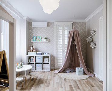 В этой небольшой комнате есть всё, что нужно маленькой принцессе по имени Василиса. Уютная кровать-домик, игровая зона с балдахином, столик для творчества, ну и, конечно, вместительный шкаф для множества нарядов. Родителей беспокоила стеклянная дверь, ведущая на балкон, поэтому мы решили закрыть её высокими ставнями, которые в итоге дополнили общую концепцию интерьера. Комната не претендует на звание "самой креативной", но для нас было важнее создать уютную нежную атмосферу, которая будет способствовать развитию в ребёнке творческих способностей и чувства прекрасного, а также не будет выбиваться из общего стиля современной классики, в котором выполнена вся квартира.