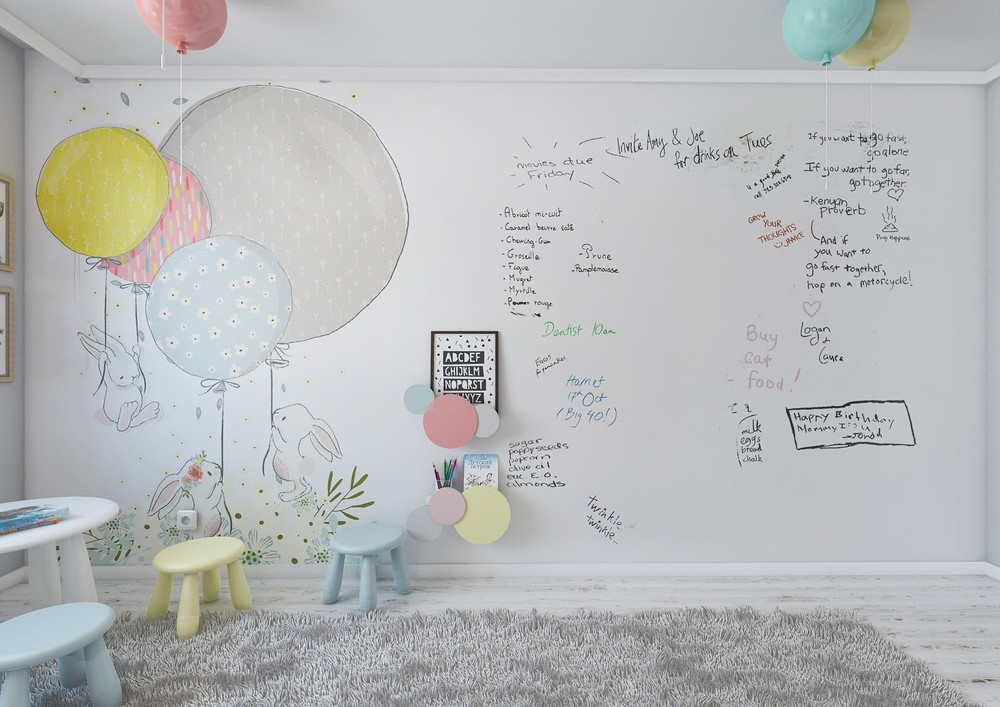 Интерьер детской комнаты в нежных тонах для маленькой принцессы. Изюминкой стала стена покрытая маркерной краской для воплощения любых идей и шедевров малышки. А веселые светильники - воздушные шары и обои с милыми кроликами так и тянут окунуться с головой в беззаботное детское веселье.
