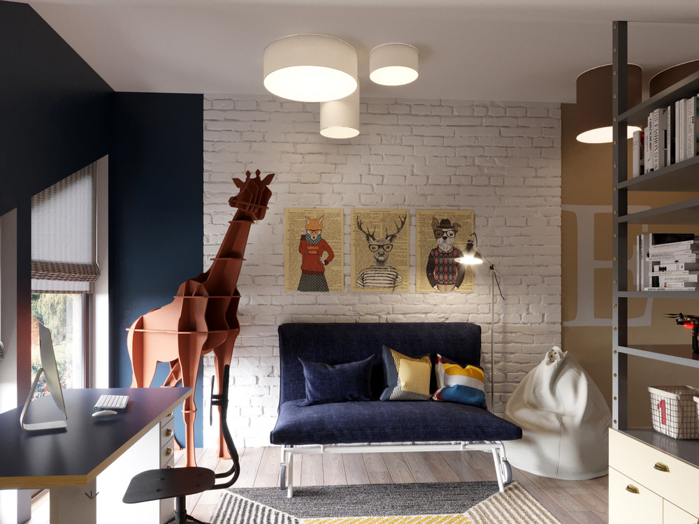 Детская комната- это маленькая квартира в квартире. В ней должны поместиться и спальня, и кабинет, и гардеробные, и спорт-зал, и при этом должно остаться свободное пространство для игр и движения. И конечно, она должна быть немножко сумасшедшей, нереальной или сказочной. Проект этой детской был создан для мальчика 8 лет, с учетом всех детских потребностей и пожеланий.