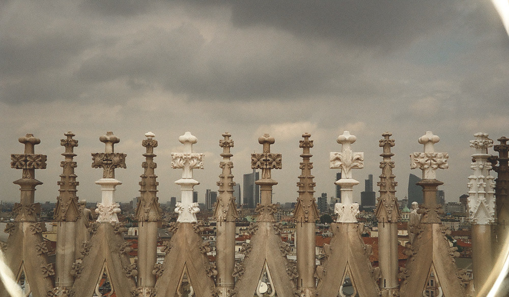 Вид с крыши Кафедрального собора Duomo di Milano на небоскребы района Porta Nuova, активная модернизация которого ведется с 2009 года. На снимке можно увидеть триаду современной архитектуры Милана: башню банка Unicredit (самое высокое здание Италии – 231 метр), башню Diamante («бриллиант», самое высокое здание с несущим металлическим каркасом, построенное на сегодняшний день в Италии), две жилые высотки Bosco Verticale с озеленёнными верандами, отражающие концепцию новой городской жизни. Центром района Porta Nuova является площадь Piazza Gae Aulenti. Так Piazza Duomo, на которой расположен Кафедральный собор, – сердце исторического центра Милана, а Piazza Gae Aulenti – символ нового города и будущего. Кроме того, работы над Кафедральным собором Милана ведутся постоянно, по сей день. На снимке можно увидеть, что часть резного каменного декора собора заменена на новый. Таким образом, становится понятно, что архитектура (как в глобальном плане, так и в деталях) является средой для постоянного обновления.
