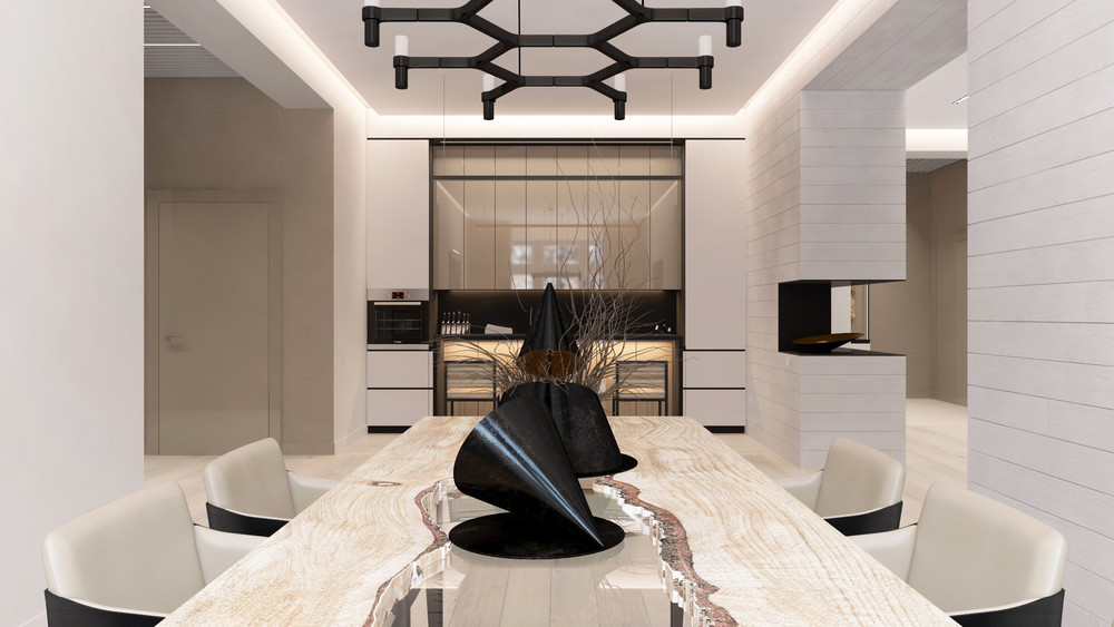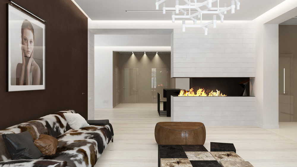 Стиль шале мы выбрали ключевым для разработки этого интерьера. Обусловлен выбор расположением дома в живописном месте на поляне соснового бора и общим архитектурным характером застройки. Все домики в лесном поселке, хоть и выполнены в современном ключе, благодаря низким двускатным крышам и отделке фасадов деревом, напоминают сельские хижины в Швейцарии. Очень хотелось, чтобы интерьер выглядел органично в этой среде. Таким образом, мы выделили основные черты, свойственные шале, но привнесли их в наш проект в ультрасовременной трактовке. Сердцем дома традиционно стал камин. Минималистичная линия огня длиной полтора метра разместилась в нише архитектурного объема в самом центре открытого студийного пространства. Пламя просматривается из всех точек помещения . Каминная зона одновременно разграничивает и связывает собой все остальные зоны. Лаконичный дизайн встраиваемых кассет, как нельзя лучше, соответствует нашей идее.