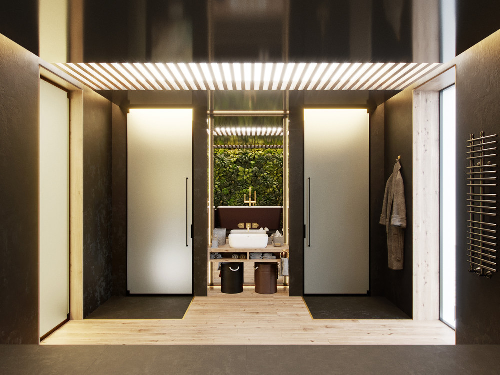 Ванная комната - особое место, где не просто тело становится чистым, но и отдыхает душа. А где лучший отдых как ни на природе. Поэтому основной концепцией проекта было перенести спокойствие и красоту природы внутрь помещения. В качестве основы был выбран черный, на фоне которого отлично вписывается как зелень, так и дерево. Несмотря на, четкое разделение на две зоны ванная выглядит как единое пространство. Высокие двери от пола до потолка скрывают за своими стеклянными матовыми полотнами зоны туалета и душа, а так же отделяют ванную от остальных помещений. Раковина была утоплена в специальную нишу, чтобы не мешал естественному свету. Окно, как единственный естественный источник света так же был выполнен во всю высоту стен. Основой всего дизайна стала отдельно стоящая ванна Squaro Edge 12 концепции Color on Demand, которая была величественно приподнята и встала на фоне фитостены и украшена золотым смесителем.