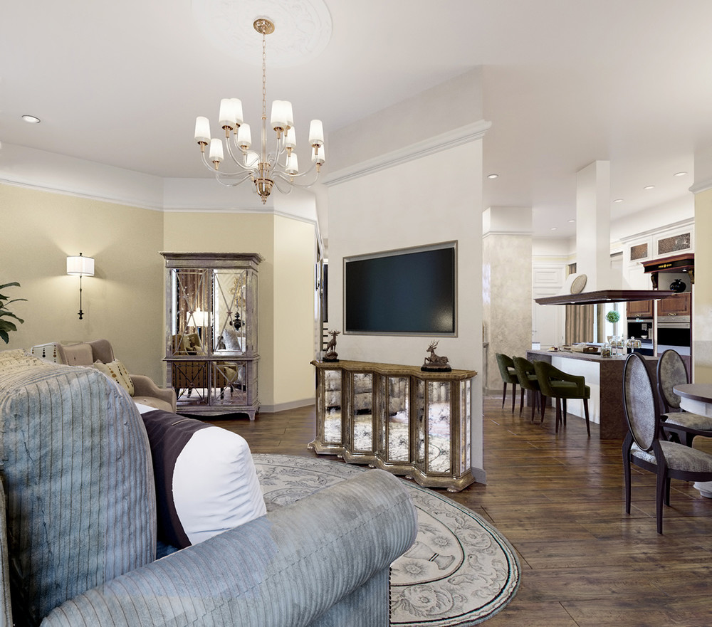 Следующим главным общим видом является вид из холла на все пространство гостиной, которая в свою очередь включает в себе зоны кухни, обеденную зону и мягкую, непосредственно саму гостиную. По центру данного пространство было предложено расположить декоративную капитальную треугольную в плане перегородку. Которая со стороны холла выполняет декоративную роль. Данная плоскость представляет собой зеркальную поверхность с изображением павлина. Зеркало выполнено в специальной обработке состаривания, а контур птицы это снятая амальгама. Так как контур птицы это не что иное, как стекло, то за панно мы заложили светодиодную ленту, таким образом в вечернее время, данное панно подсвечивается. Данная идея перетекает и на плоскость стены, которая обращена к кухне, а стеночка со стороны гостиной (мягкой зоны) служит местом для расположение телевизора.