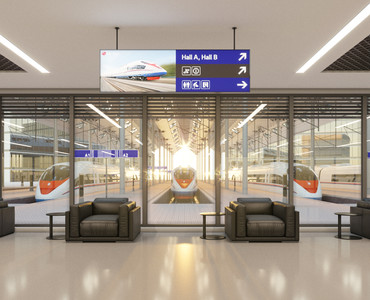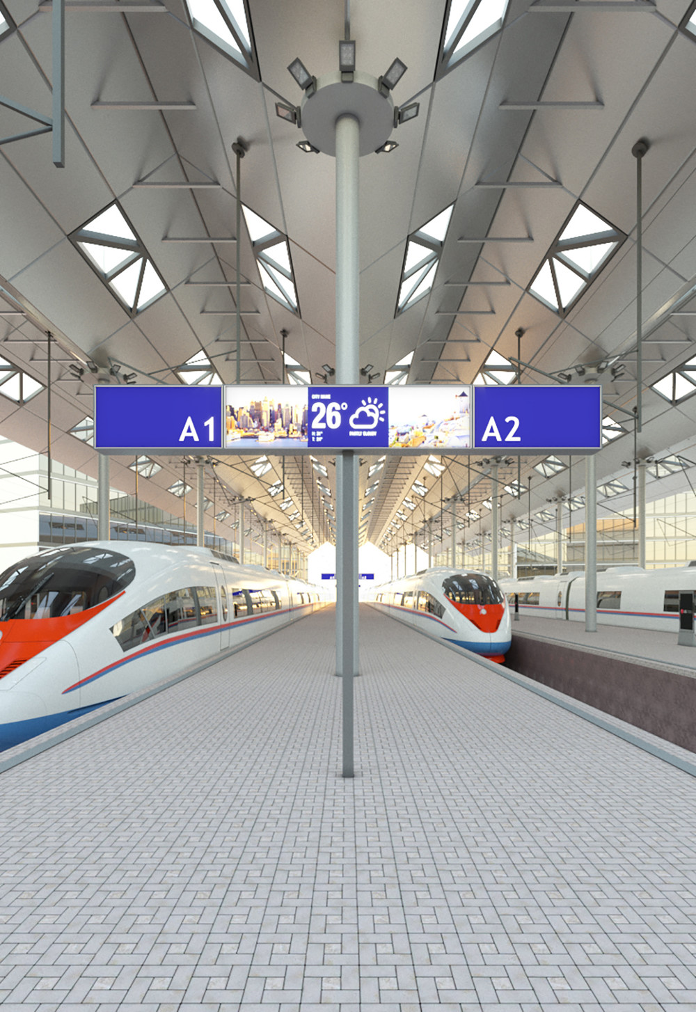 - уникальные Ultrastretch дисплеи. А именно: 88” Ultra Stretch дисплей 88BH7D и 86" Ultra Stretch дисплей 86BH5C-BF. Данные системы используются, как информационное табло, для размещения расписания поездов и навигации по вокзалу.