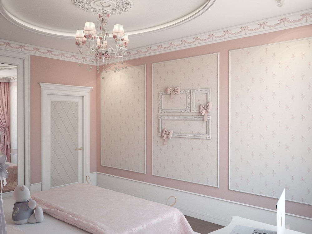 Номинация "Мягкие панели" Детская девочки в частном доме. Изголовье кровати оформлено мягкими панелями в резной раме и с балдахином. Работа выполнена в рамках интерьерной студии DeLuxe г.Красноярск