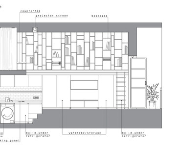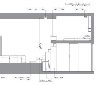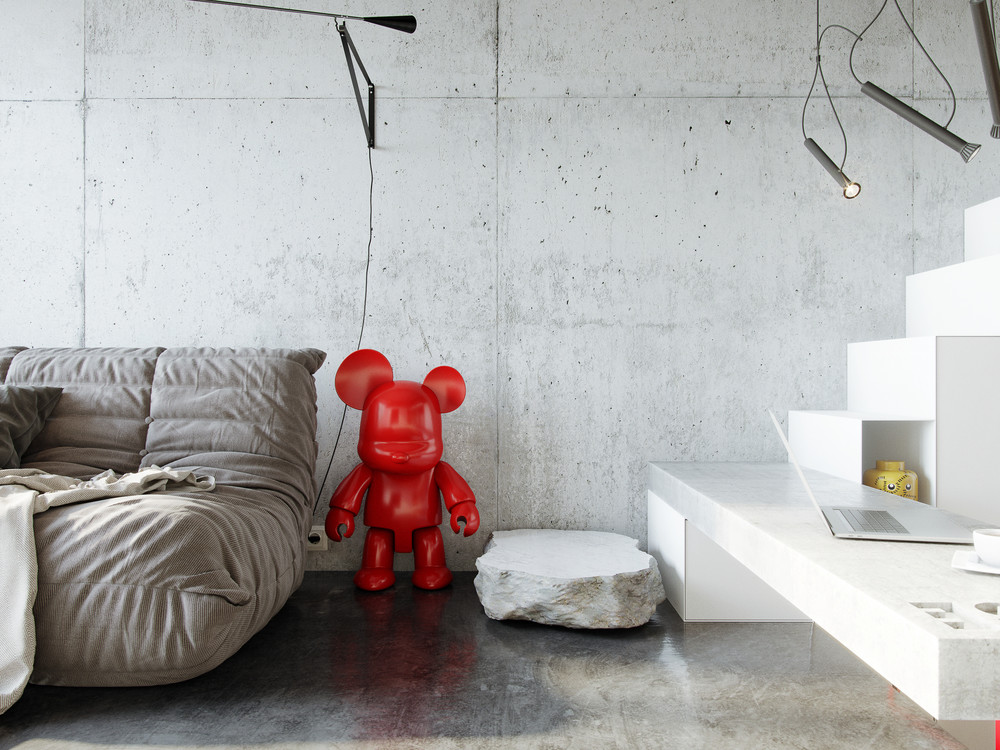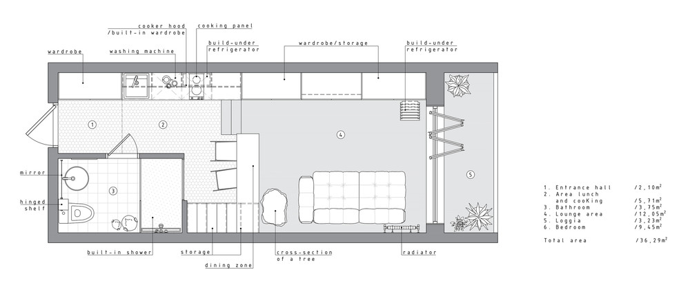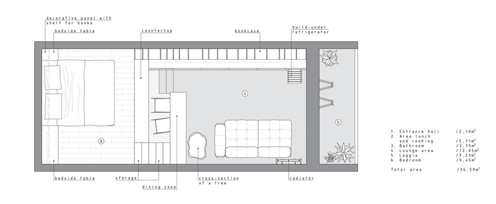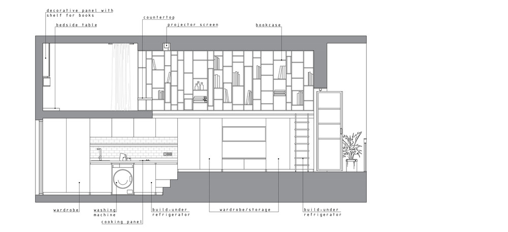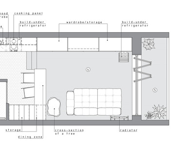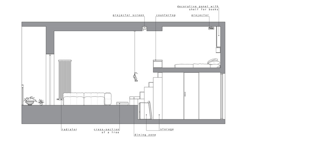Рациональное использование пространства стало ключевым моментом данного проекта. Сложность проектирования заключалась в нестандартных габаритах квартиры – большая длина, при маленькой ширине, также имелся перепад пола и высокие потолки, что кардинально повлияло на конструктивное решение. Лестница стала продолжением барной стойки и вещевого шкафа, что позволило рационально использовать площадь квартиры. Коридор совмещен с кухней, где разместились стиральная машина и мини холодильник. В свою очередь антресольный этаж стал зоной для сна и работы где рабочим местом выступает столешница, отгораживающая верхний уровень, а в потолке скрыт экран для проектора. Так что нужно отметить, что при небольшой площади квартире в ней присутствует все, что может понадобиться для комфортного проживания.