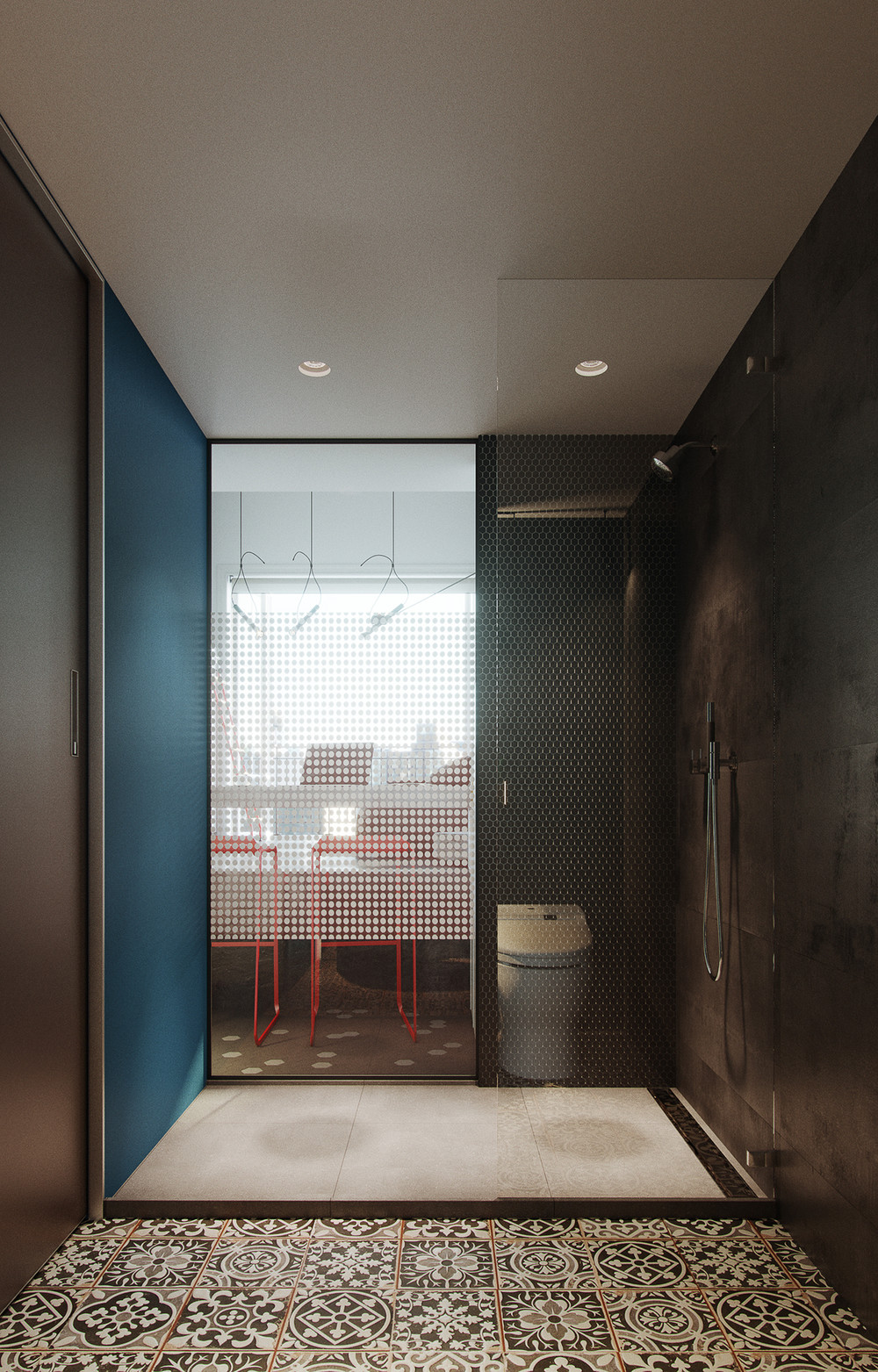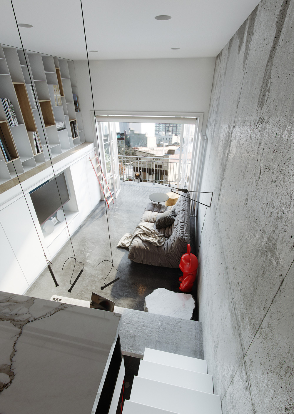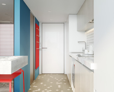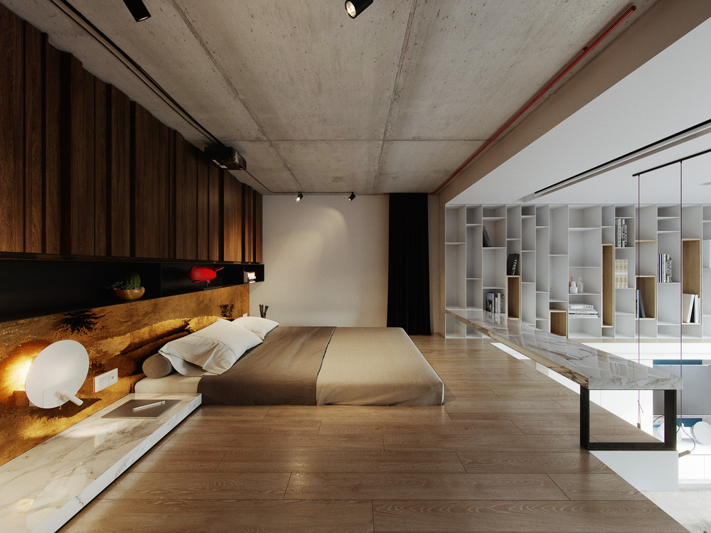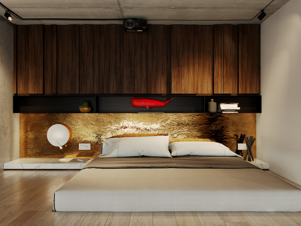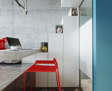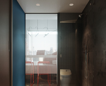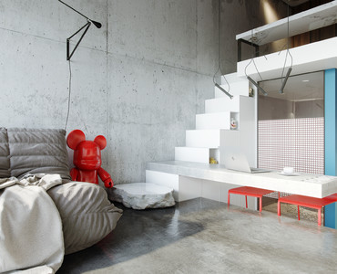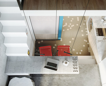 Проект был выполнен удаленно для молодого студента, проживающего в Барселоне. Рациональное использование пространства стало ключевым моментом данного проекта. Сложность проектирования заключалась в нестандартных габаритах квартиры – большая длина, при маленькой ширине, также имелся перепад пола и высокие потолки, что кардинально повлияло на конструктивное решение. Лестница стала продолжением барной стойки и вещевого шкафа, что позволило рационально использовать площадь квартиры. Коридор совмещен с кухней, где разместились стиральная машина и мини холодильник. В свою очередь антресольный этаж стал зоной для сна и работы где рабочим местом выступает столешница, отгораживающая верхний уровень, а в потолке скрыт экран для проектора. Так что нужно отметить, что при небольшой площади квартире в ней присутствует все, что может понадобиться для комфортного проживания.