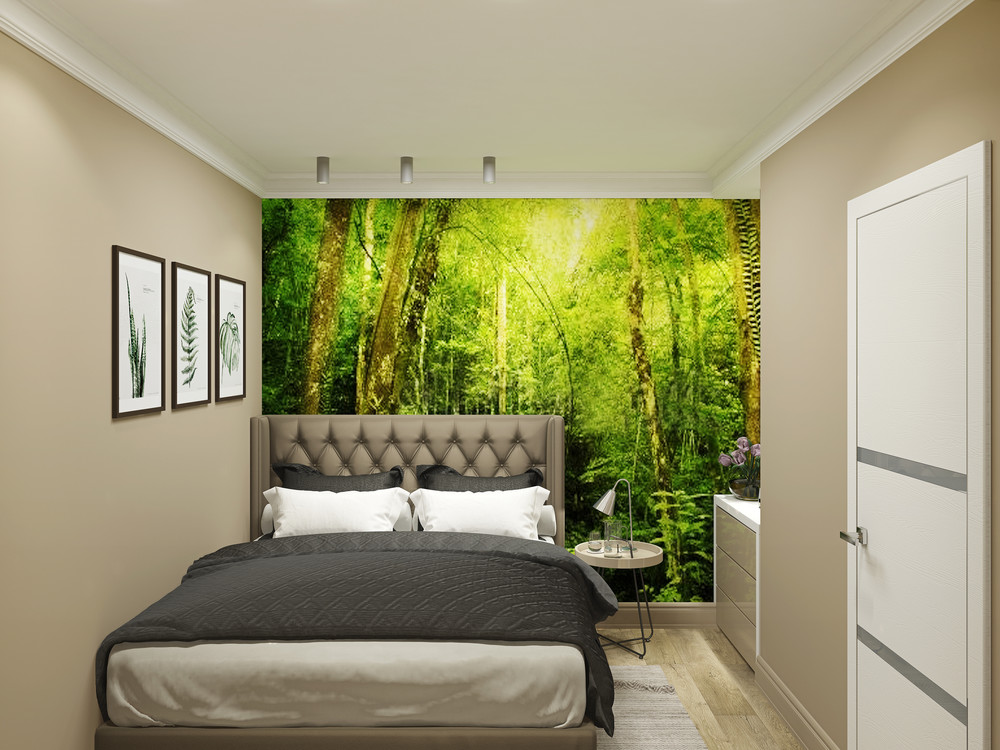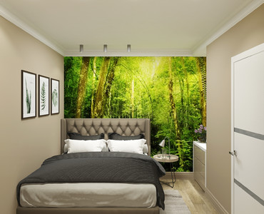 Спальня. Справа от кровати - то самое «Законное» место для комода - он же туалетный столик, о котором упоминается в описании проекта. На Стене за изголовьем кровати - фотопечать. Выбрали фактуру - «Штукатурка». В процессе реализации добавили еще один потолочный светильник.