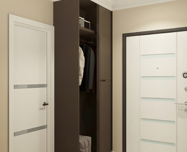 4. Стена между входной группой и спальней выстроена таким образом, чтобы со стороны спальни у туалетного столика было свое логичное и законное место, а в коридоре не менее законное место было у шкафа-купе для верхней одежды. Особенное внимание стоит уделить тому факту, что дверь-купе шкафа «уезжает» в специально отведенное пространство между стенами. Подробнее в комментариях к картинкам.