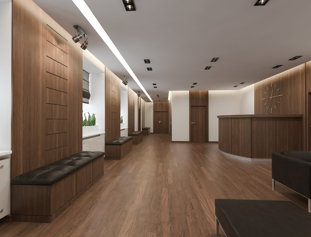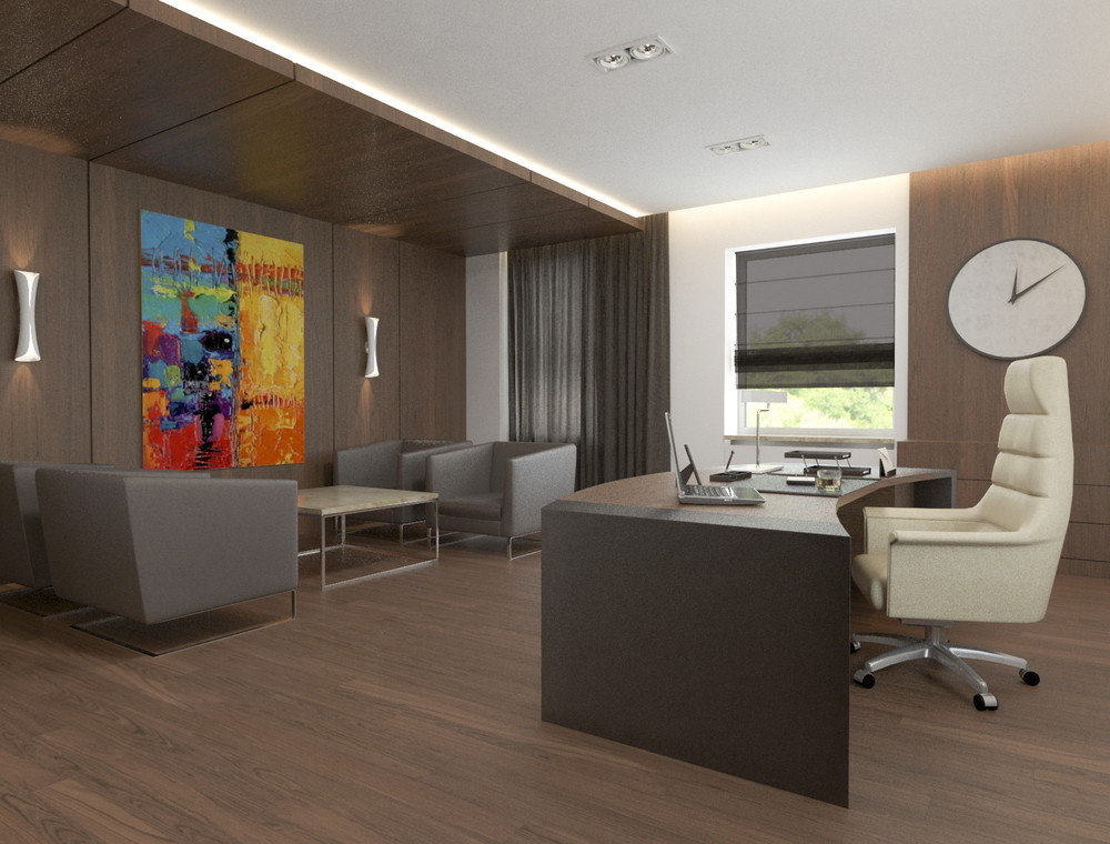 Офисное помещение разделено на несколько пространств. Кабинет руководителя, приемная и зал совещаний выполнены в респектабельной стилистике. Подчеркивая статус предприятия. Используемые материалы только натуральные. Кожа, массив дерева, декоративная штукатурка, металл. Вторая часть проекта выполнена в современной стилистике, с функционально рациональным использованием пространства и с учетом требований по технической оснащённости. Материалы метал, дерево, белый текстиль.