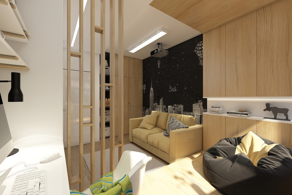 Третья из имеющихся комнат будет спальней, которая со временем станет детской. В этой спальне есть вместительный шкаф, диван и рабочая зона. Рабочая зона выделена декоративным подиумом, который эффективно зонирует пространство, а также несет за собой дополнительную зону для хранения. Таким образом, приподняв пол можно спрятать, например, несезонные вещи.