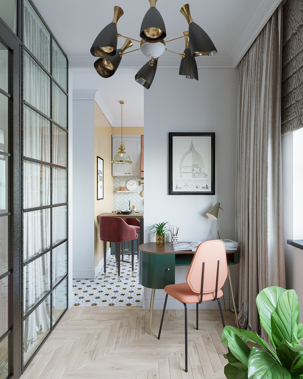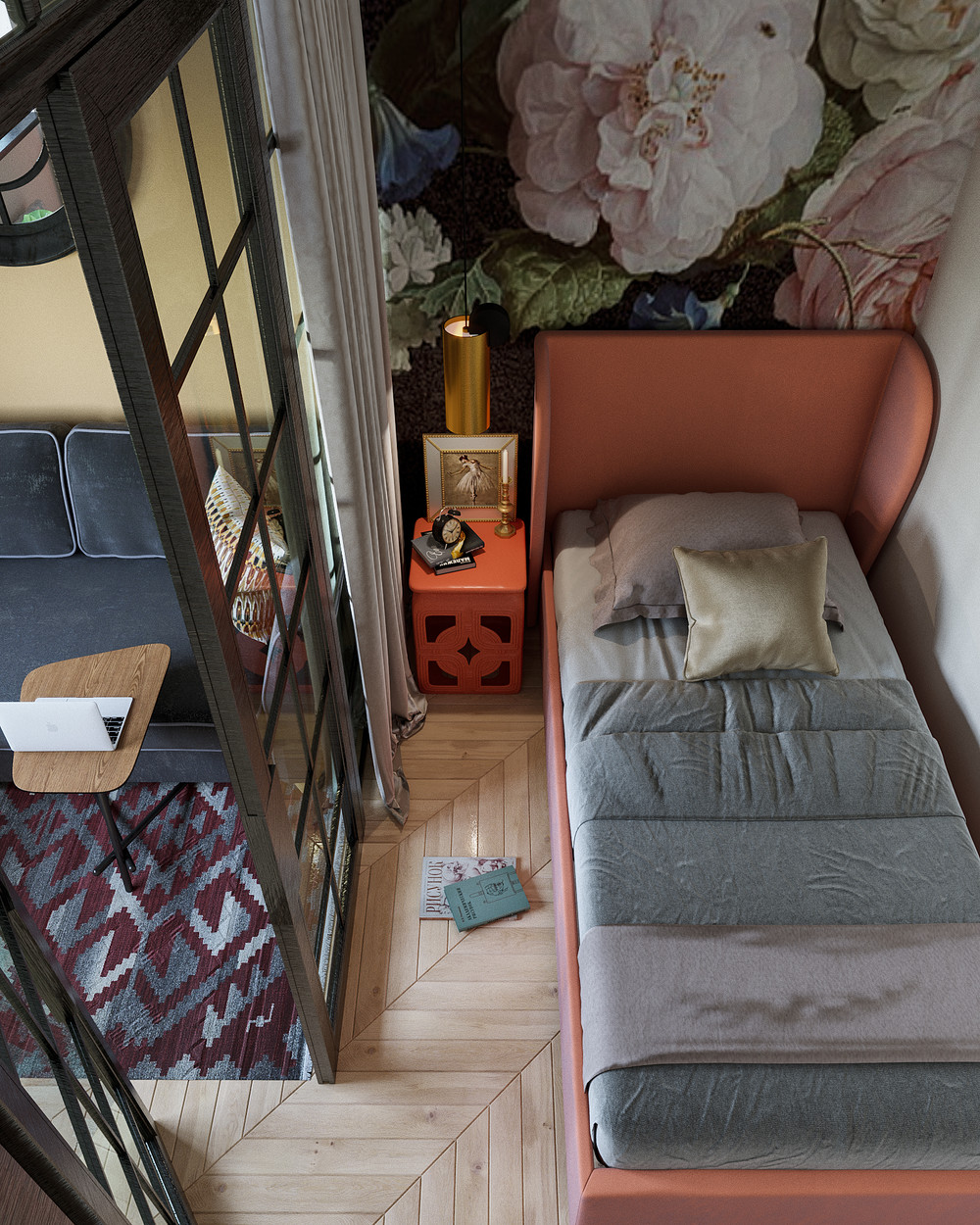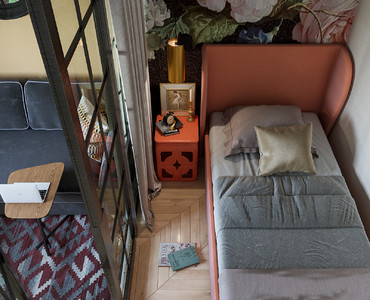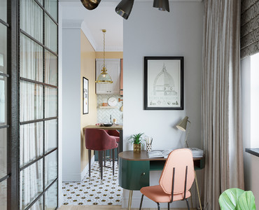 Проект создан для юной особы, которая увлекается архитектурой и живописью. Одним из главных пожеланий было создать яркое и креативное пространство, в котором бы отразились увлечения заказчицы. В квартире, общей площадью 28 кв.м., получилось создать удобное пространство для полноценной жизни: гостиная с диваном (при желании можно разложить в кровать для гостей), спальня, огороженная перегородкой и шторами, кухня, прихожая и су с душевой.