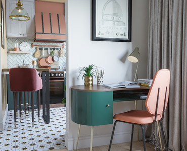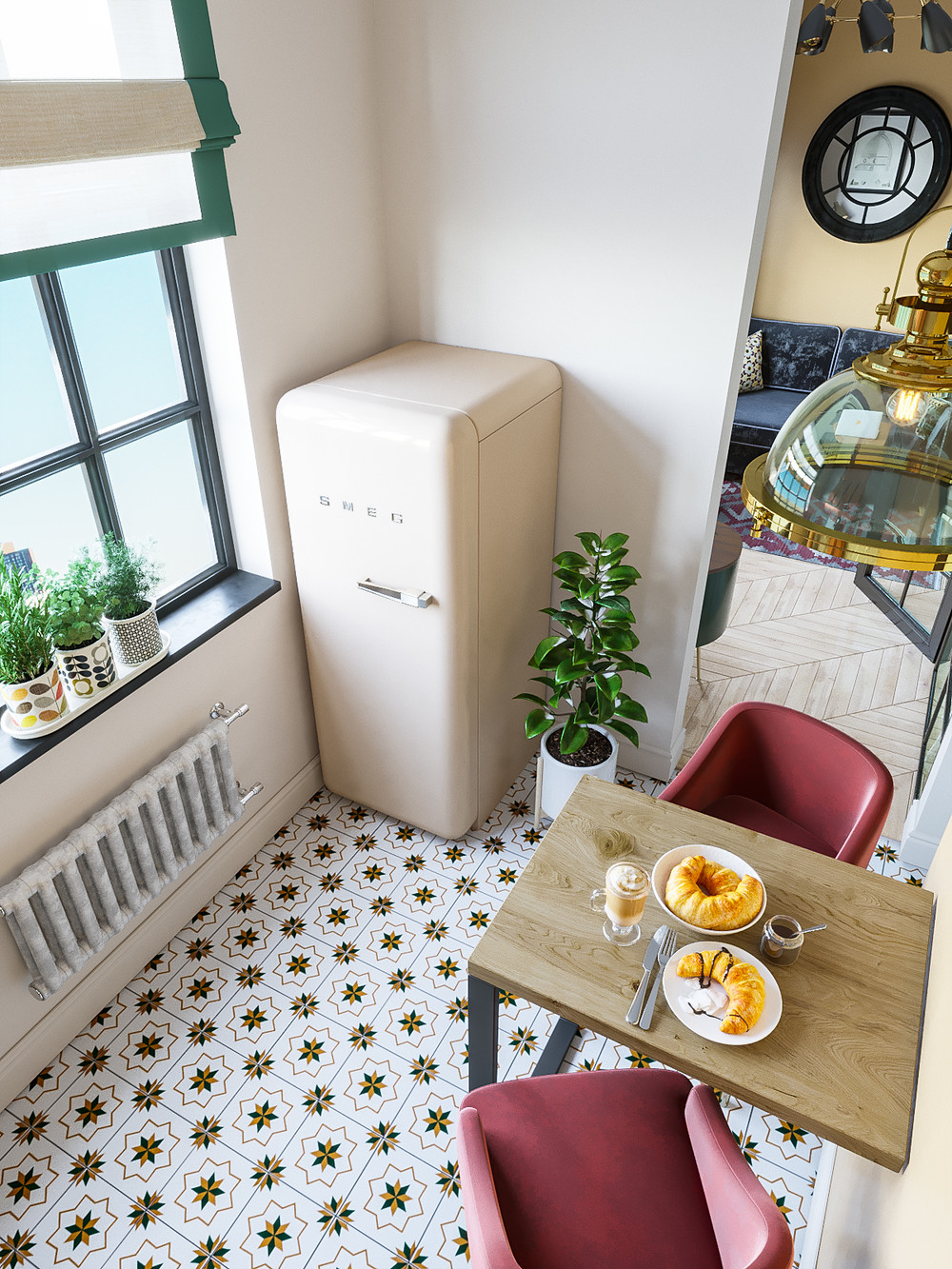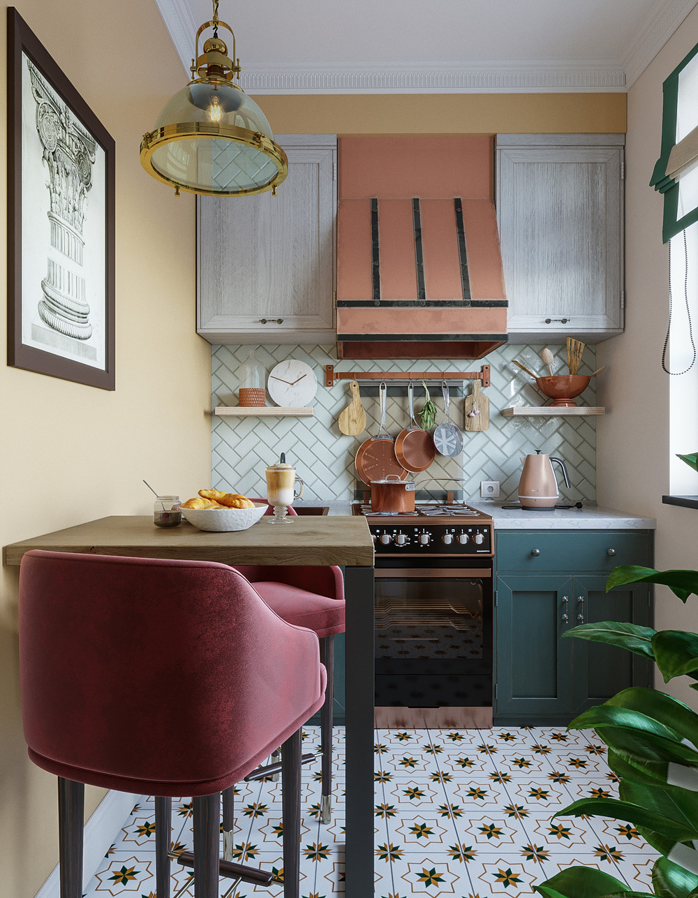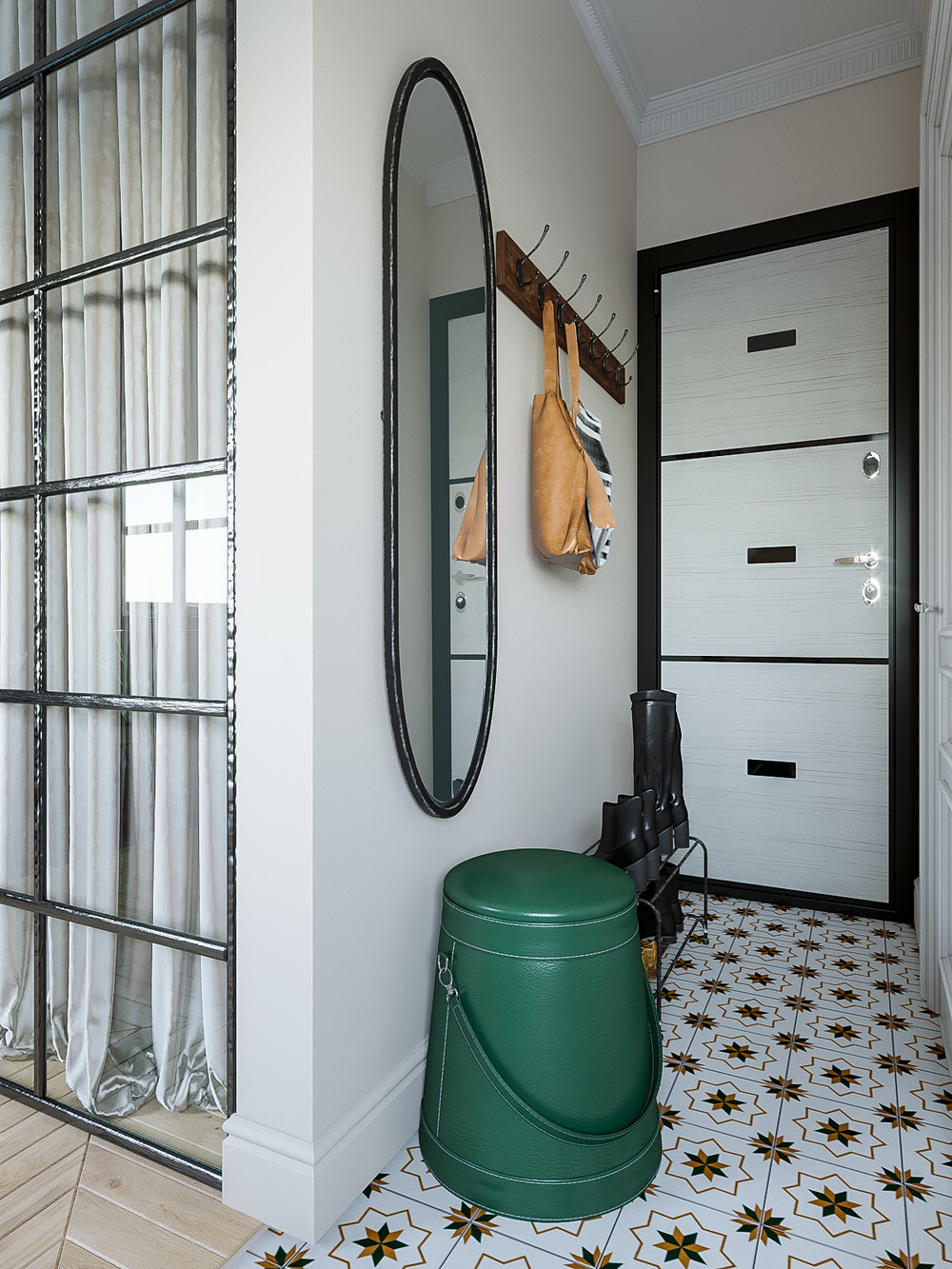 Проект создан для юной особы, которая увлекается архитектурой и живописью. Одним из главных пожеланий было создать яркое и креативное пространство, в котором бы отразились увлечения заказчицы. В квартире, общей площадью 28 кв.м., получилось создать удобное пространство для полноценной жизни: гостиная с диваном (при желании можно разложить в кровать для гостей), спальня, огороженная перегородкой и шторами, кухня, прихожая и су с душевой.