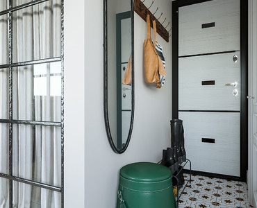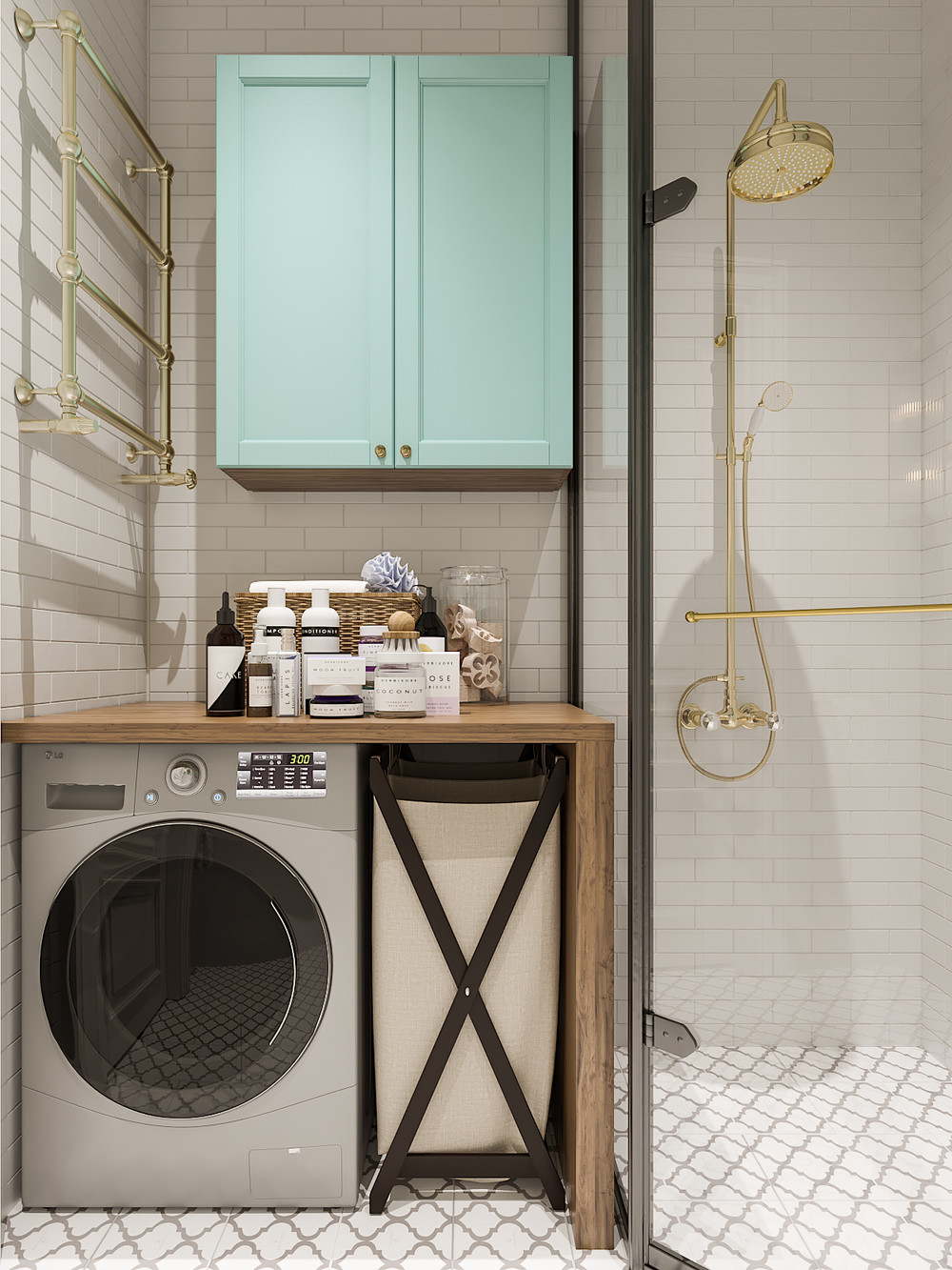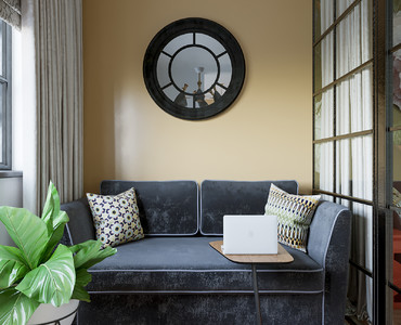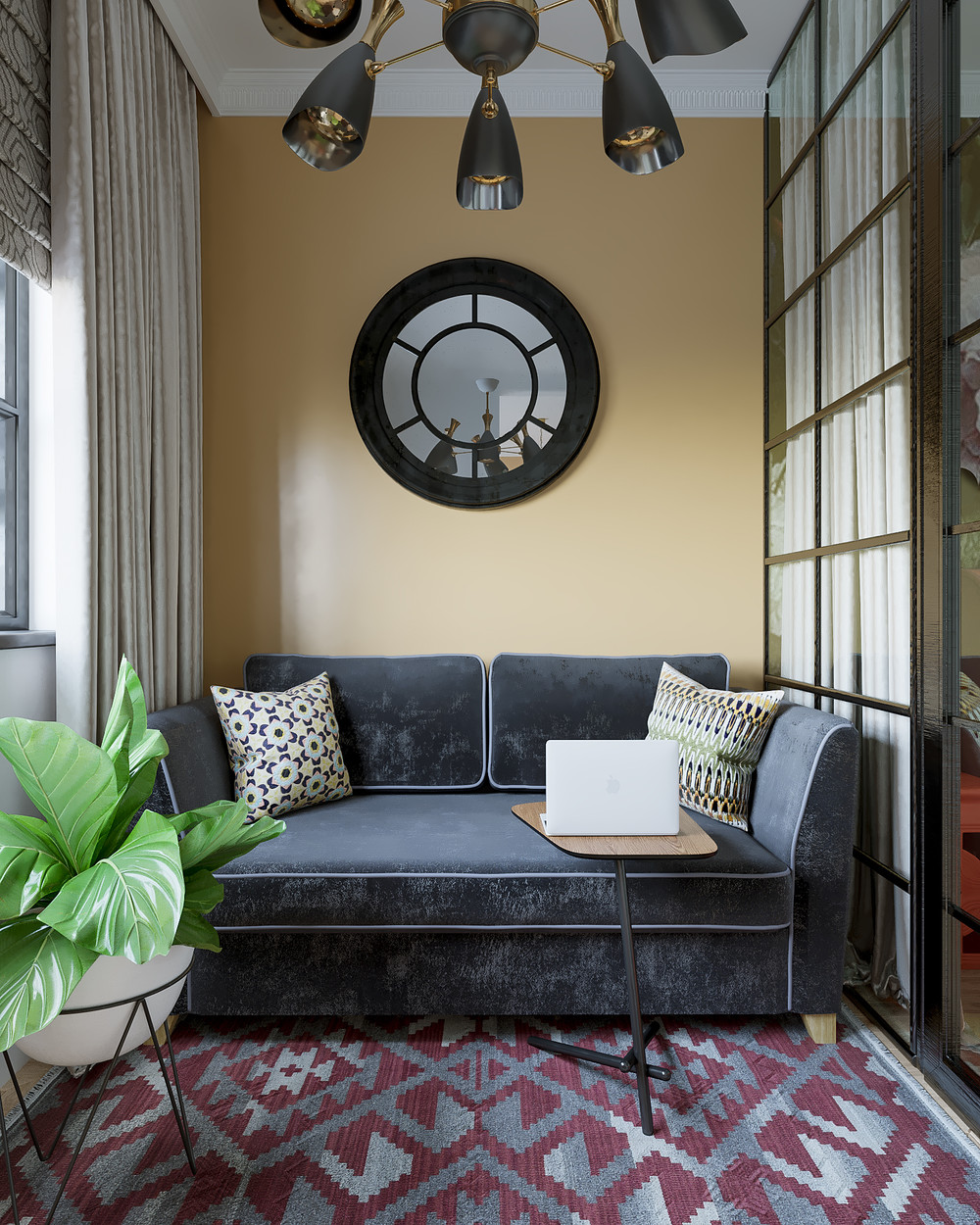 В квартире, общей площадью 28 кв.м., получилось создать удобное пространство для полноценной жизни: гостиная с диваном (при желании можно разложить в кровать для гостей), спальня, огороженная перегородкой и шторами, кухня, прихожая и су с душевой.