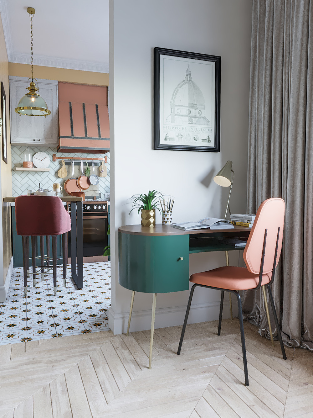 Проект создан для юной особы, которая увлекается архитектурой и живописью. Одним из главных пожеланий было создать яркое и креативное пространство, в котором бы отразились увлечения заказчицы.