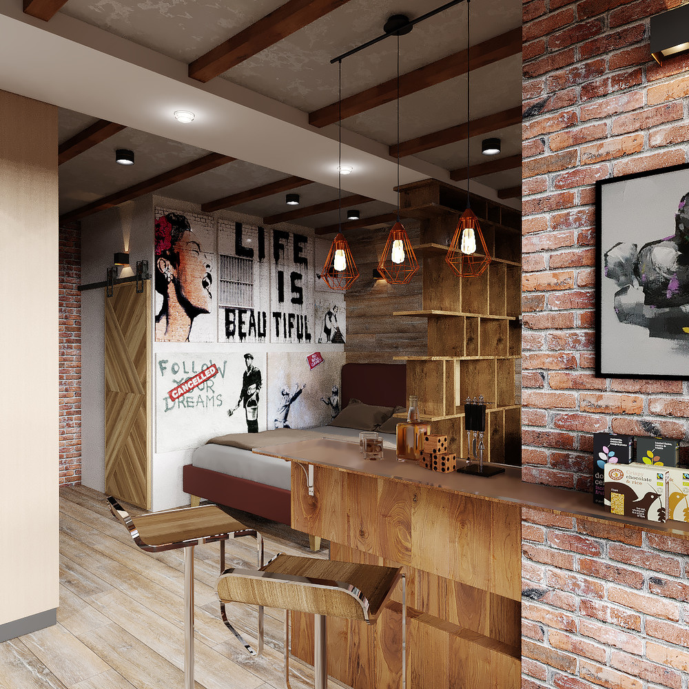Квартира общей площадью 40 (м2) предназначена для проживания молодого человека.Хозяин квартиры увлекается компьютерами,поэтому здесь присутствует основательное рабочее место с компьютером. При разработке интерьера придерживались стиля "Лофт",который очень нравится молодому человеку.Проект в номинации "Интересы,как среда обитания".