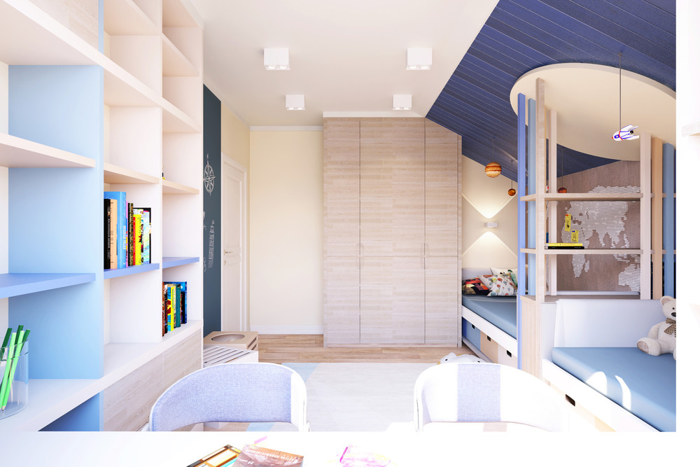 Детская комната для двух любознательных деток, увлеченных астрономией и географией. Импровизированная солнечная система становится подвластна маленьким хозяевам этого интерактивного интерьера. Планеты и межгалактические космические станции на удобных подвесах разместились на наклонной части потолка, обшитого деревянными панелями глубокого синего цвета. Стеллаж для книг между двумя спальными «отсеками» с одной стороны создает необходимый уют и изолированность для каждого «члена космического экипажа», с другой стороны сохраняет контакт и возможность совместного общения сквозь открытые полки стеллажа. У деревянного потолка стеллаж завершается круглым диском со скрытой подсветкой, символизирующим солнце, вокруг которого собираются подвешенные к потолку планеты. Пробковое покрытие на стене рядом с кроватями позволило создать карту мира из канцелярских кнопок. На карте юным исследователям удобно отмечать места своих ярких путешествий, прикрепляя фотографии в нужную точку мира. Захватывающий полет под названием «Детство» протекает прекрасно и увлекательно!