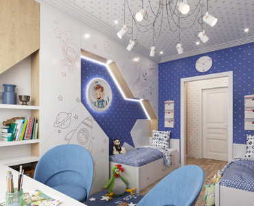 В данном помещении детской комнаты использована мебель со скрытыми механизмами открывания по обе стены! Мебель состоит из модулей, которые формируют собой формы ракет. При проектировании была задача максимально использовать пространство для возможности хранения, при этом не перегружая его мебелью! Было найдено решение, интегрировать мебель в интерьер таким образом, чтобы она формировала его форму и концепцию, при этом не перегружая!