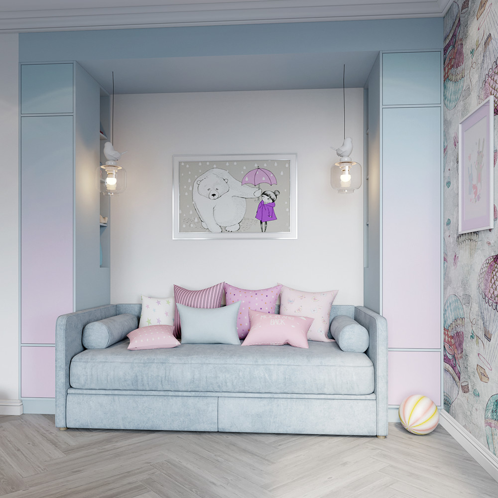 Эта детская началась с домиков, к ней плавно подключились мотивы путешествий и всё пространство было решено окунуть в оттенки зефирных снов. Домики, к тому же, могут служить в качестве ночника, пока ребенок засыпает или готовится ко сну.