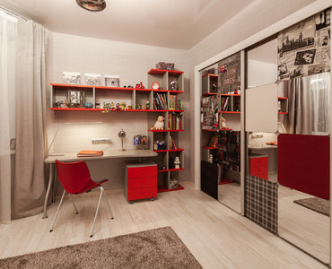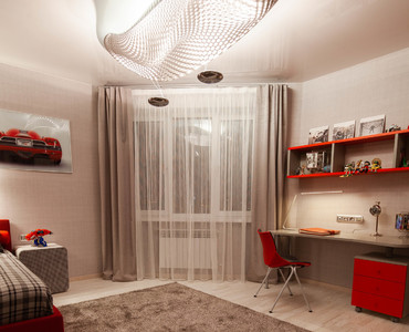 Дизайн детской комнаты на прямую зависит от возраста и пола ребёнка, для которого он создаётся. У каждого возраста есть свои пристрастия, интересы и увлечения, которые и определяют то, в какой атмосфере хотел бы находится ребёнок. Исходя из этих предпосылок, была предпринята попытка создания интерьера, который мог бы меняться вместе с ребёнком. При создание дизайн-проекта детской комнаты для маленького мальчика был разработан уникальный декоративный приём в стиле пэчворк в эффектном современном исполнении, использованный для оформления акцентной стены и дверей шкафа-купе. Уникальность его заключается в том, что каждый модуль можно легко снять и поменять местами с другим, в том числе и с раздвижных дверей шкафа! На создание подобной идеи автора вдохновила детская игра в "пятнашки" Благодаря особому креплению и небольшим размерам панелей со скруглёнными углами ребёнок может сам формировать общий рисунок стены, словно пазл, меняя настроение комнаты хоть каждый день. А возможность химчистки позволяет родителям не беспокоиться о чистке панелей. Панели дополнены применением зеркал, на разных уровнях, соразмерных ребёнку. Главным акцентом потолка стал потолочный светильник Cosmic Angel от фабрики Artemide, космический дизайн и ячеистая поверхность которого притягивает внимание, создавая ощущение, что этот яркий арт-обьект пренебрегает законами гравитации.