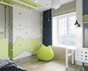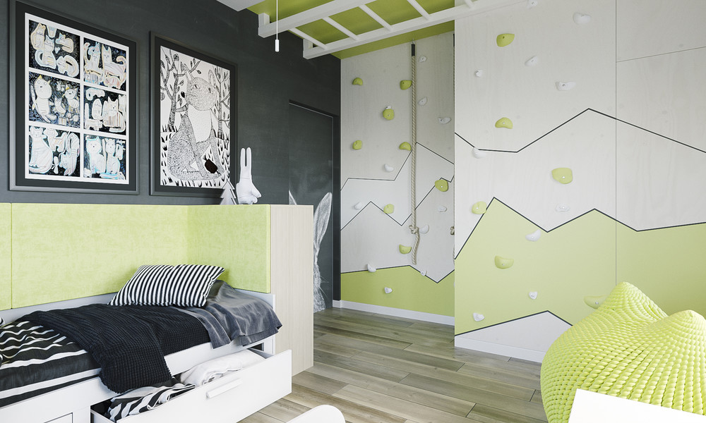 Комната с необычным лаймовым акцентом, шарами-светильникам, канатами на стене и спрятанным шкафом.