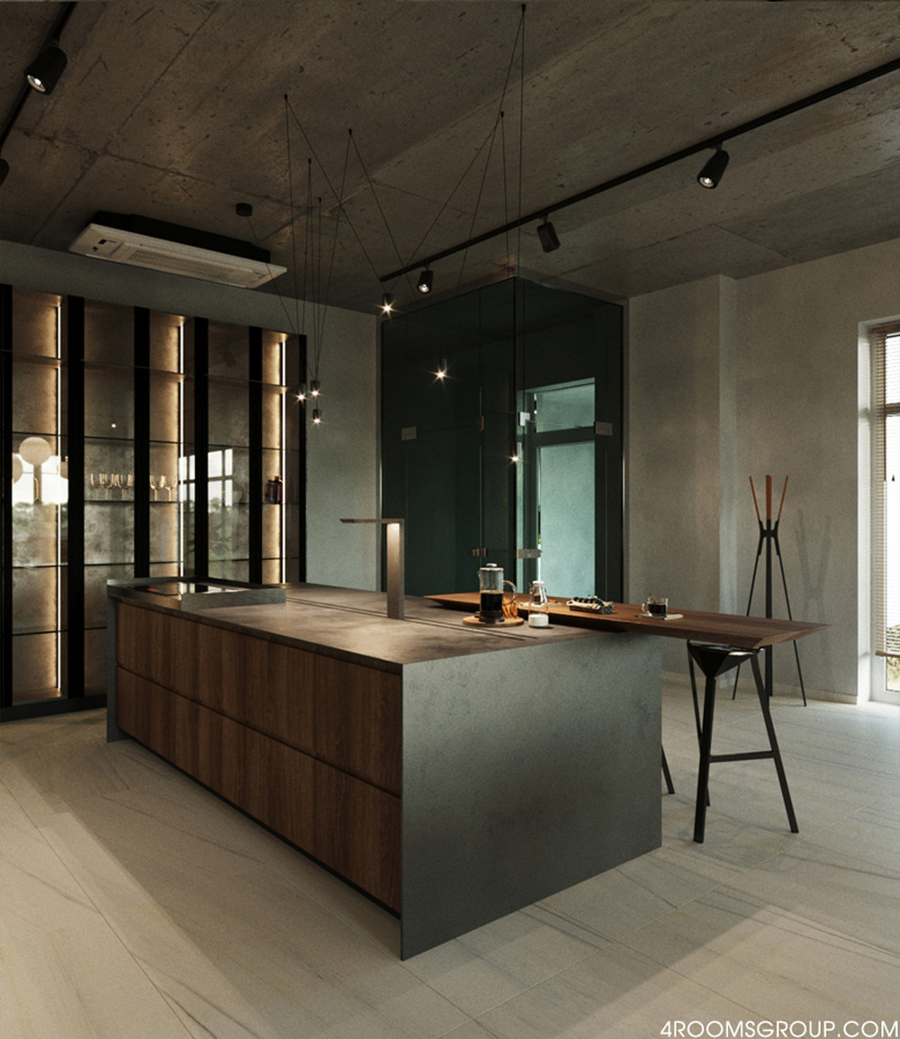 Данное помещение площадью почти 80 квадратных метров находится в частном доме. Кухня-гостиная занимает почти весь первый этаж. Стиль помещения был определён архитектурой здания, созданной в современном, брутальном стиле loft. Заказчиком является мужчина средних лет. Простота отделки подчёркивает элегантность и роскошь мебели Европейских брендов.