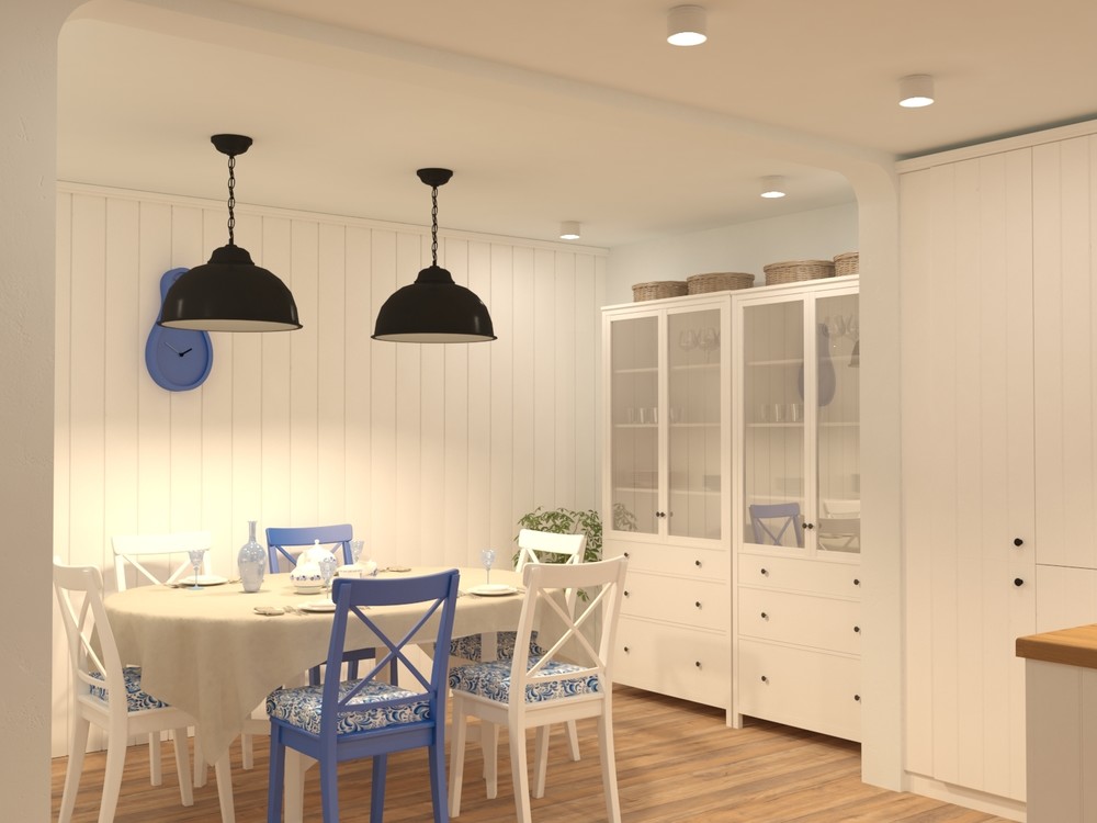 Кухня была спроектирована для хозяйки, которая любит готовить, поэтому в ней есть вся необходимая техника и много мест хранения, а рисунок гжели на изразцовой плитке фартука, декоративных тарелках и подушках ведет нас к истокам - к прикладному искусству среднерусской полосы.