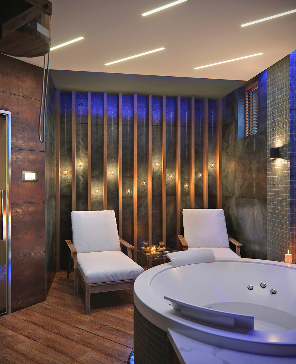 Небольшая СПА-зона в цокольном этаже частного дома. Пример того, как ржавый металл и бетон могут выглядеть дружелюбно, уютно и стильно благодаря правильному освещению и сочетанию с теплыми фактурами дерева. 100% Diesel style!