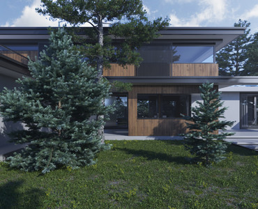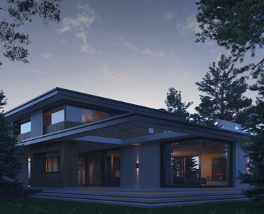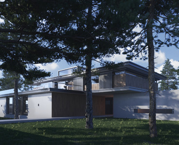 Проект современного дома в поселке Николина гора. Архитектурно композиционное решение дома и общее планировочное зонирование обусловлено его местоположением на участке. Одной из важнейших задач являлось организация связи пространств помещений дома и территории участка. Дом предусматривает возможность использования участка со всех его сторон. Так, у главной зоны отдыха на южной стороне дома была большая открытая терраса с летней кухней, а попасть на нее удобно как из гостиной / Каминной зоны, так и через кухню / обеденную, пространство которых объединено. Проект также включат возможность сезонного использования кровли первого этажа, попасть на который можно с холла галереи второго этажа. Площадка на кровле имеет цельное стеклянное ограждение и прекрасный вид на лес, который в свою очередь играл важнейшую роль в проектировании дома, таким образом в ходе проектных работ и будущих работ реализации проекта ни одно дерево не пострадает! Отдельно хочется отметить то, что дом, не смотря, на его строгие формы, удалось на наш взгляд сделать не высоким, не массивным, как в общем визуальном отношении, так и цветовым решении фасадов и сочетании материалов.
